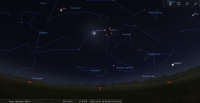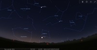 - A 5h29, la Lune est conjointe à Jupiter dans le plan équatorial, la planète 2°55’ au Nord ; élongation solaire de la Lune 33° Est.