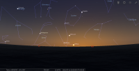 Devant le Taureau (Tau) ; longitude écliptique 3e GEM, il se couche à 21h57 pour notre localisation, soit 50 minutes après le Soleil.