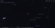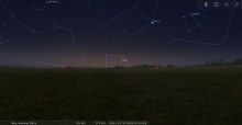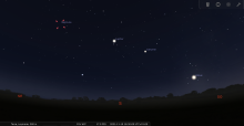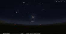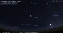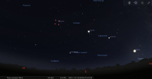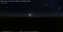 Le 19 au soir, elle se lève à l’Est-nord-est 10 minutes après le coucher du Soleil, entre les Pléiades et Aldébaran ;
