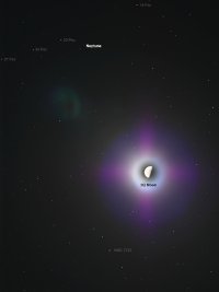 - A 0h12, la Lune est conjointe à Uranus dans le plan équatorial, la planète 0°03’ au Nord ; élongation solaire d’Uranus 46° Ouest.