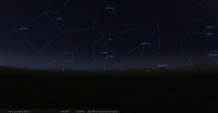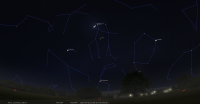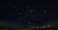 - A 4h18, la Lune est conjointe à Mars dans le plan équatorial, la planète 3°13’ au Sud ; élongation solaire de Mars 70° Est
