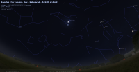 devant la Balance, elle culmine à 2h00, à 26° de hauteur et se couche le 6 mai à 6h52, soit une vingtaine de minutes après le lever du Soleil.