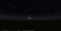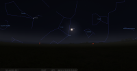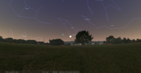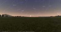 Le 12 février au soir, elle se lève à l’Est-nord-est, un peu plus près de l’Est que la veille (à droite), à 18h13 pour notre localisation, soit 3 minutes avant le coucher du Soleil,