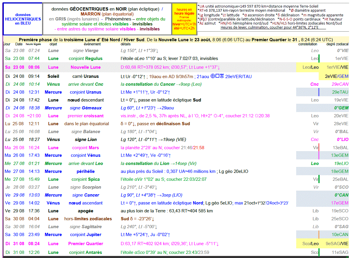 - A 7h24, la Lune entre dans le signe de la Vierge ; Lg 150° à 180° ; sa latitude est alors de +1°39’, descend.