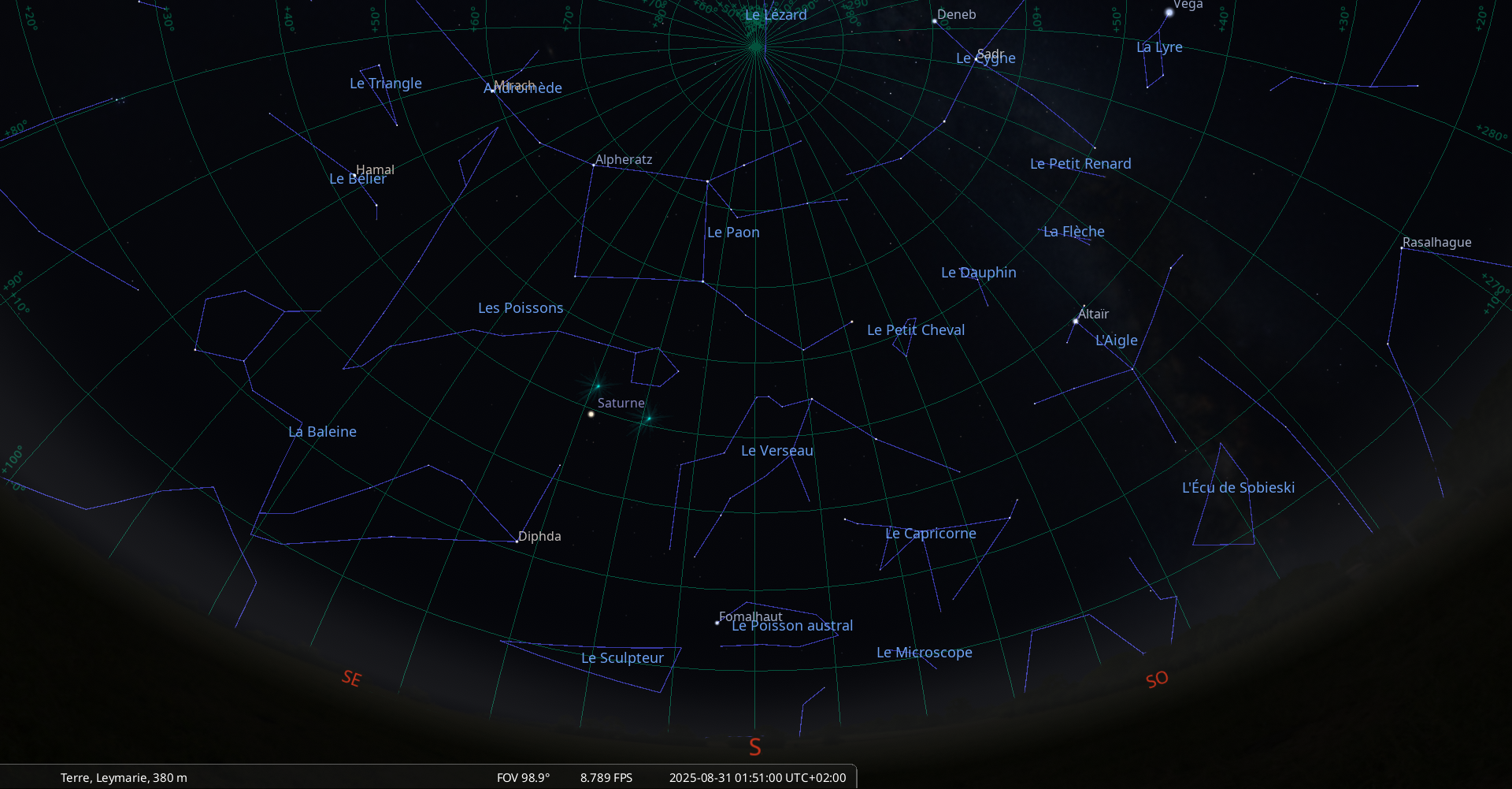 il se trouve au raz de l’horizon, à 2° de hauteur pour notre localisation, à l’Ouest (azimut 272°) ;