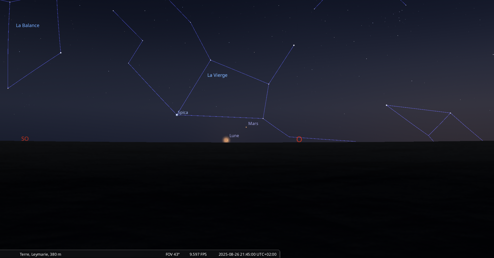 Ce soir, pour notre localisation, la Lune se couche à 22h03, Spica à 22h07.