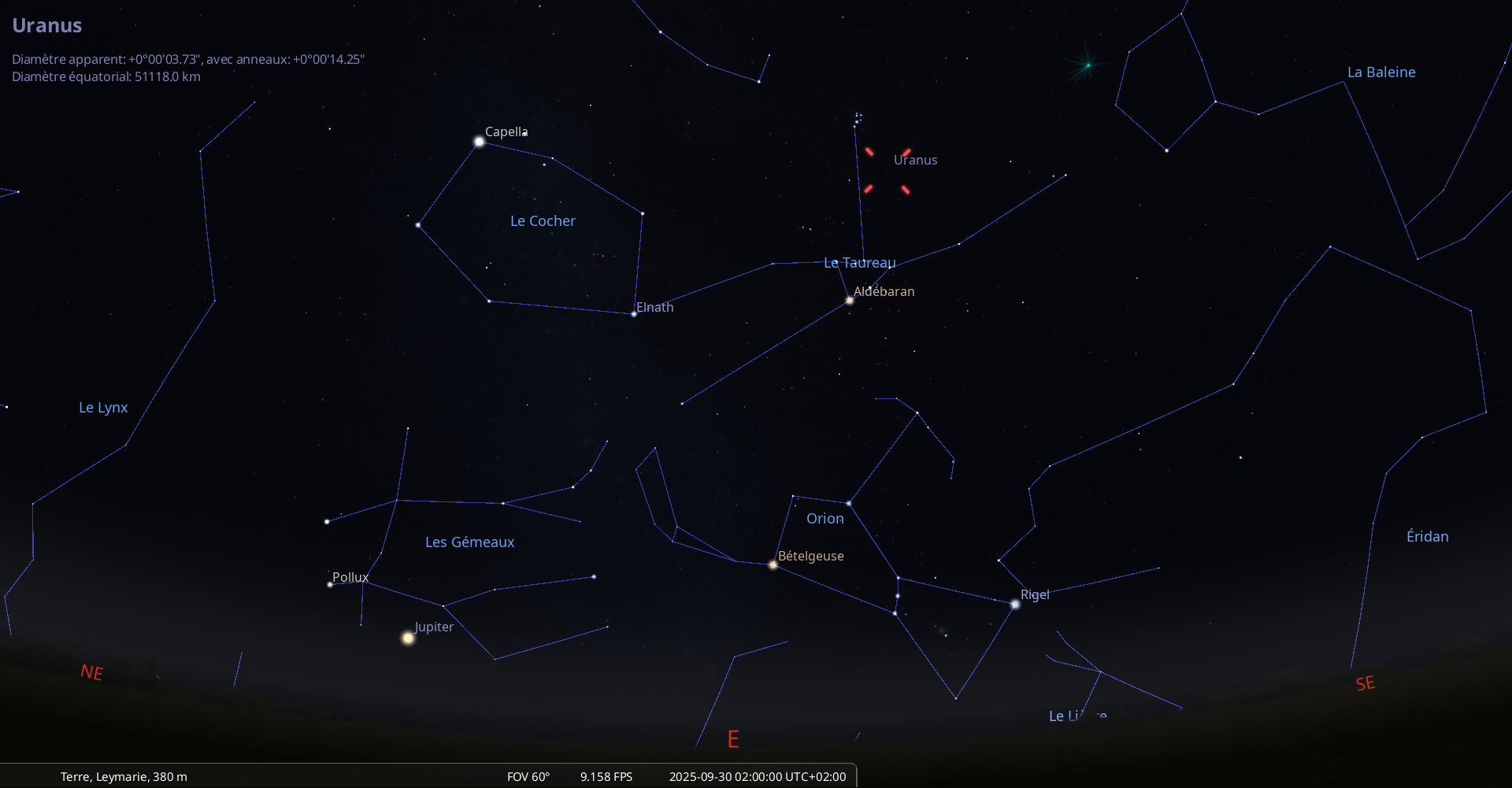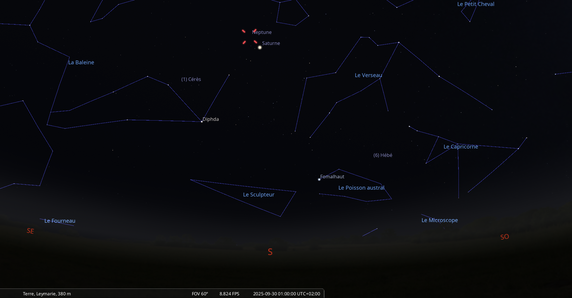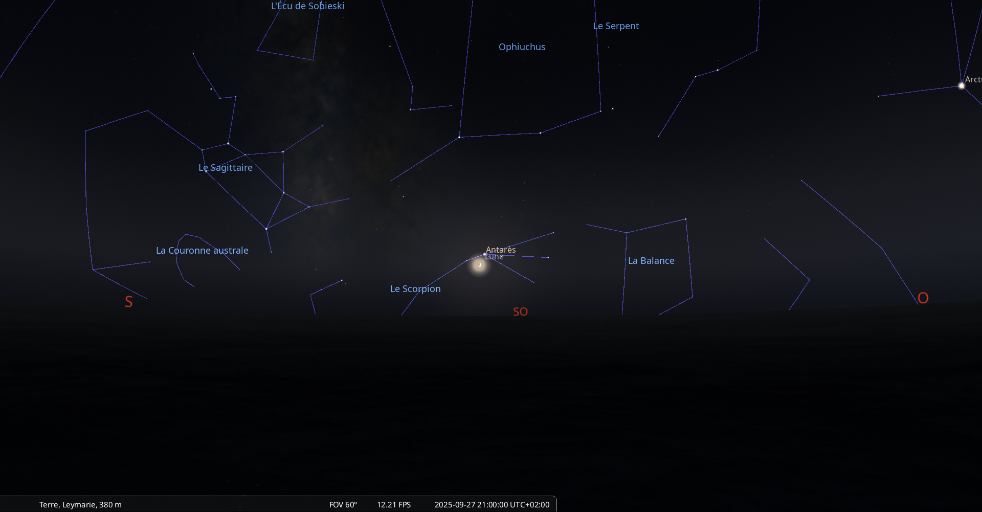 il se trouve au raz de l’horizon, à 1° de hauteur pour notre localisation, à l’Ouest-sud-ouest (azimut 249°) ;