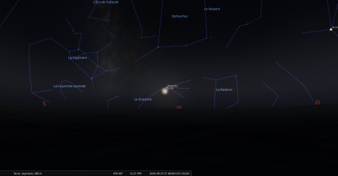 - A 1h49, la Lune arrive devant la constellation du Scorpion (Sco) ; longitude 241°05’ (2e SAG) ; latitude -5°01’, descend.