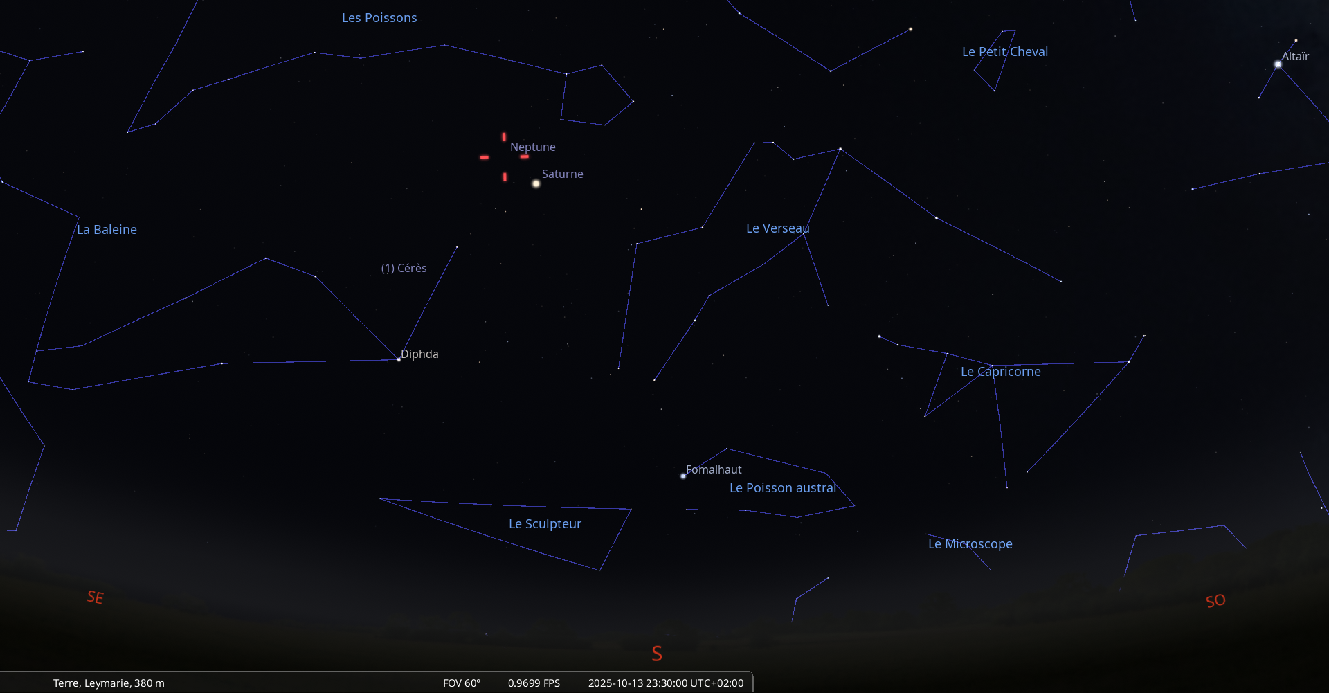 Dans la nuit du 9 au 10 octobre, pour notre localisation, Uranus (possible à voir aux jumelles sous les Pléiades)