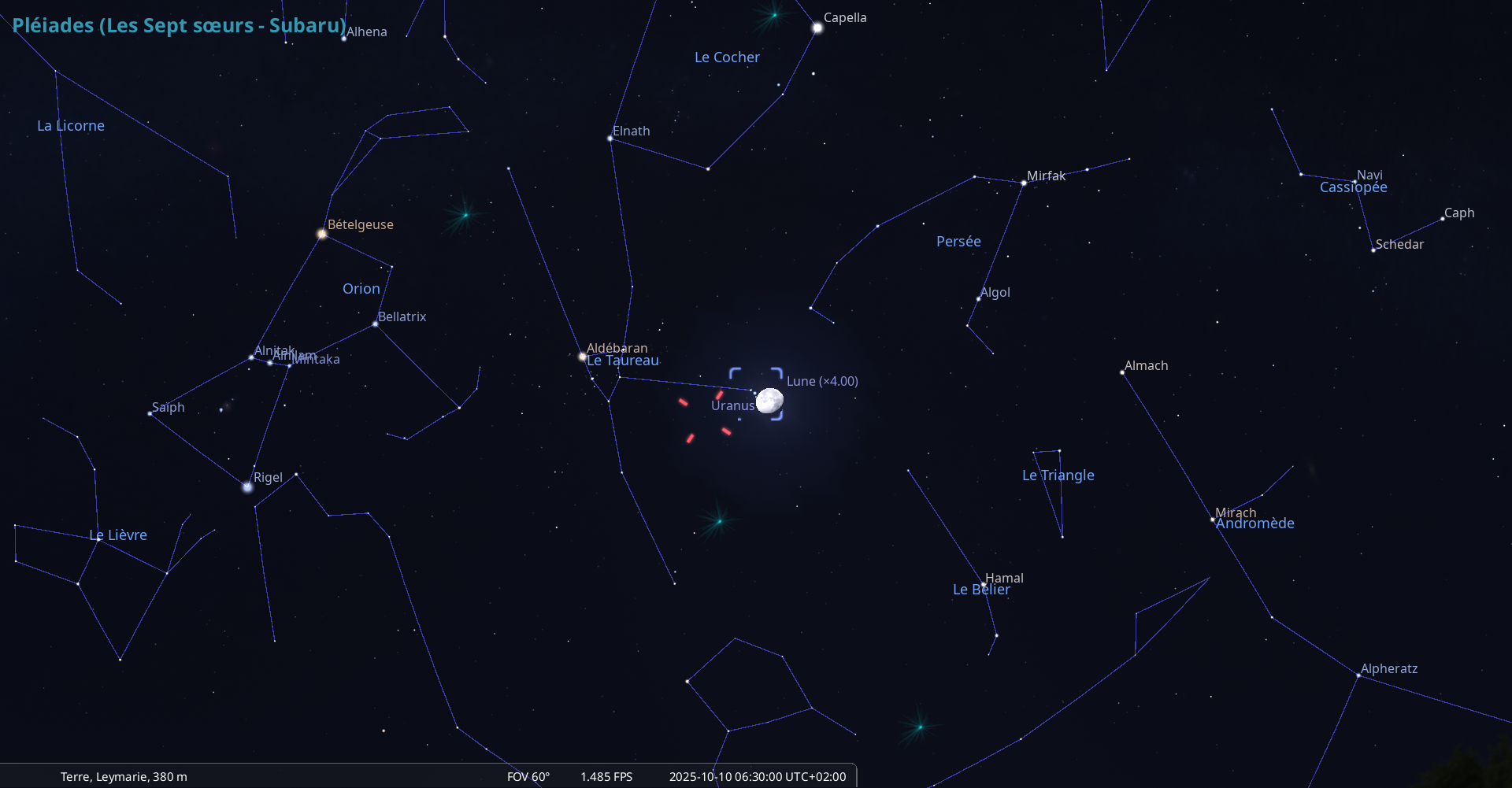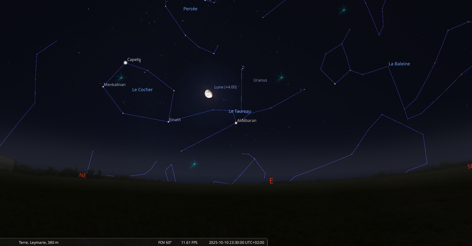 Aujourd’hui, pour notre localisation, Elnath se lève à 21h52 et la Lune à 21h51.