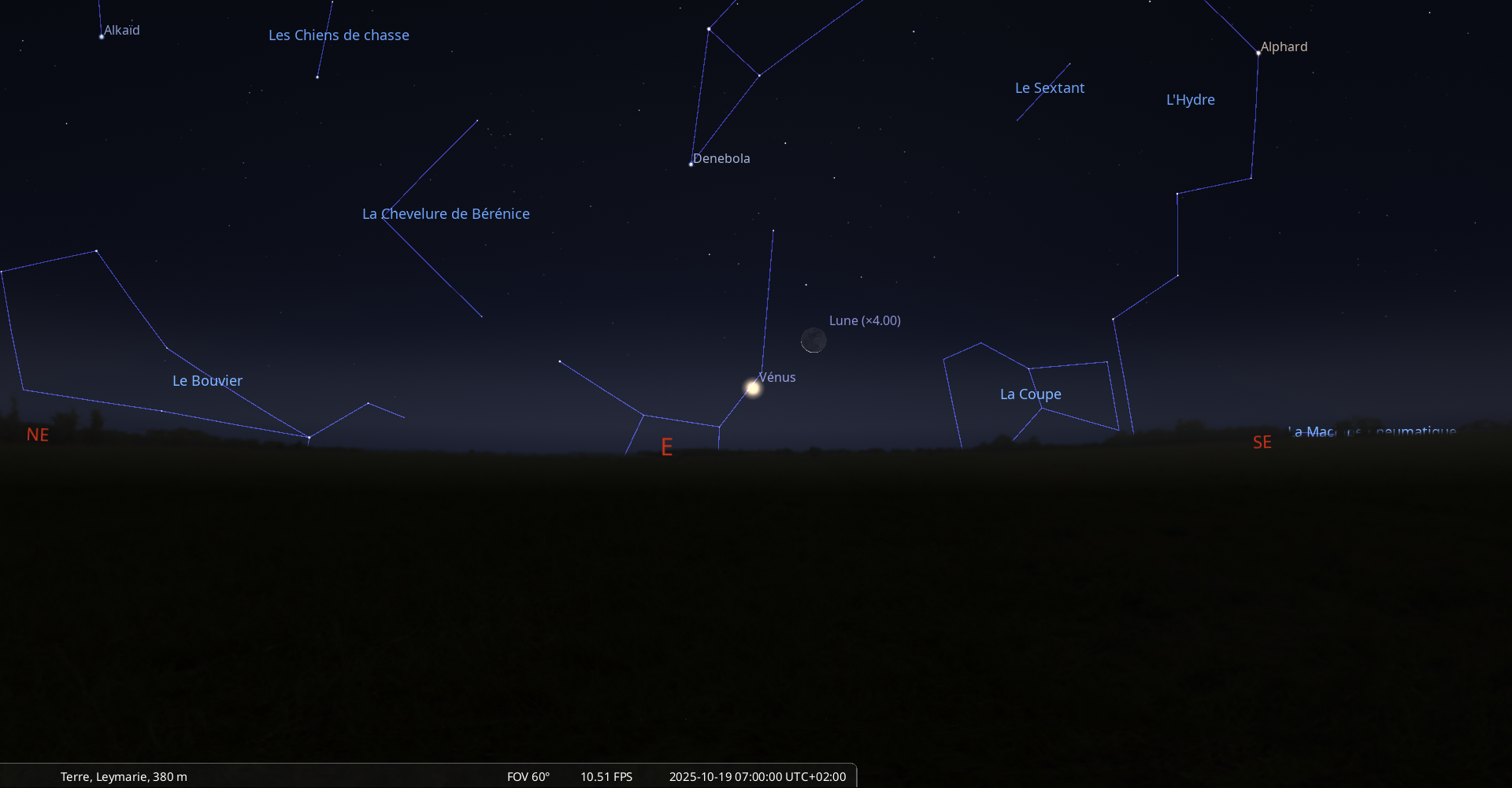 Au petit matin de ce jour, pour notre localisation, la Lune se lève à 6h02 et Vénus à 6h28.
