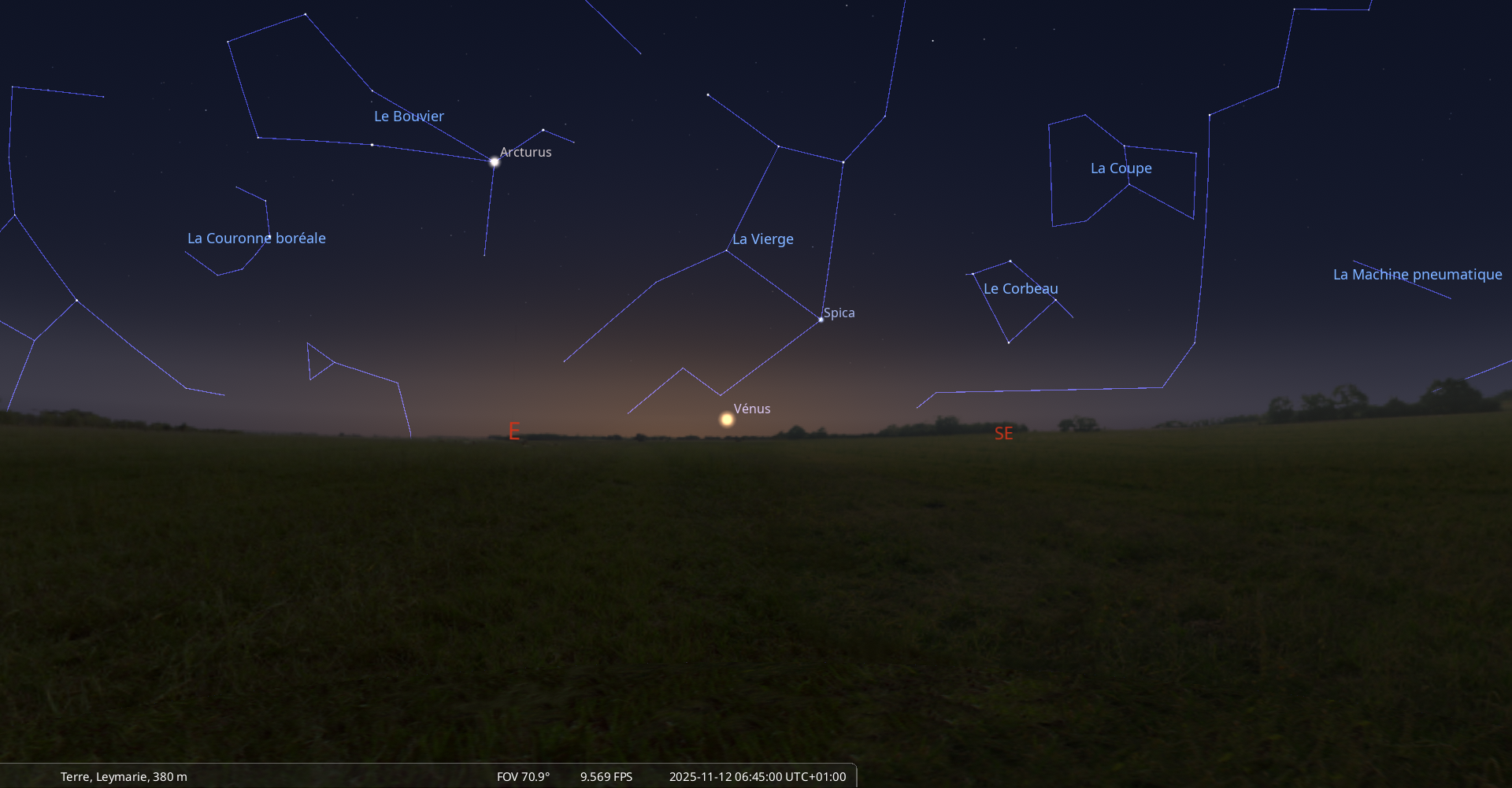 Elle se couche le 5 novembre à l’ouest-nord-ouest à 7h28 soit 6 minutes avant le lever du Soleil.