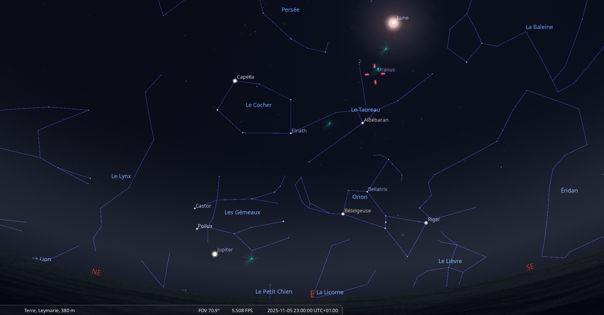 Dans la nuit du 6 au 7 novembre, pour notre localisation, les Pléiades se lèvent à 17h50, la Lune à 17h52 et Uranus à 18h11 ;