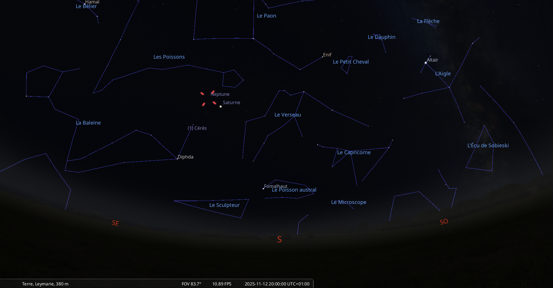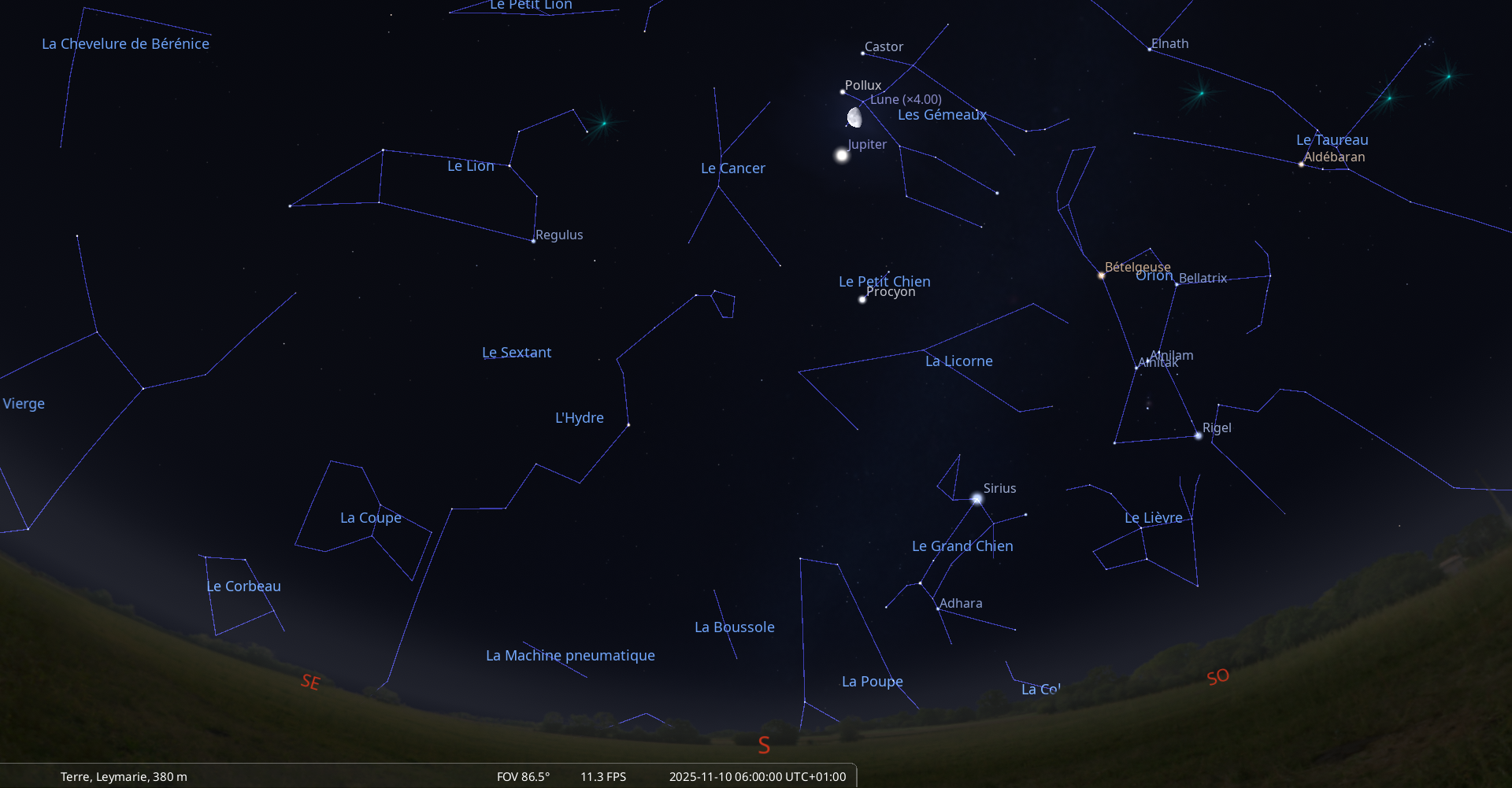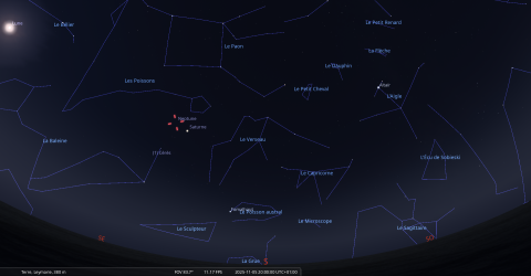 La nuit du 9 au 10 novembre, pour notre localisation, Jupiter se lève à 21h49 et culmine à 5h21.