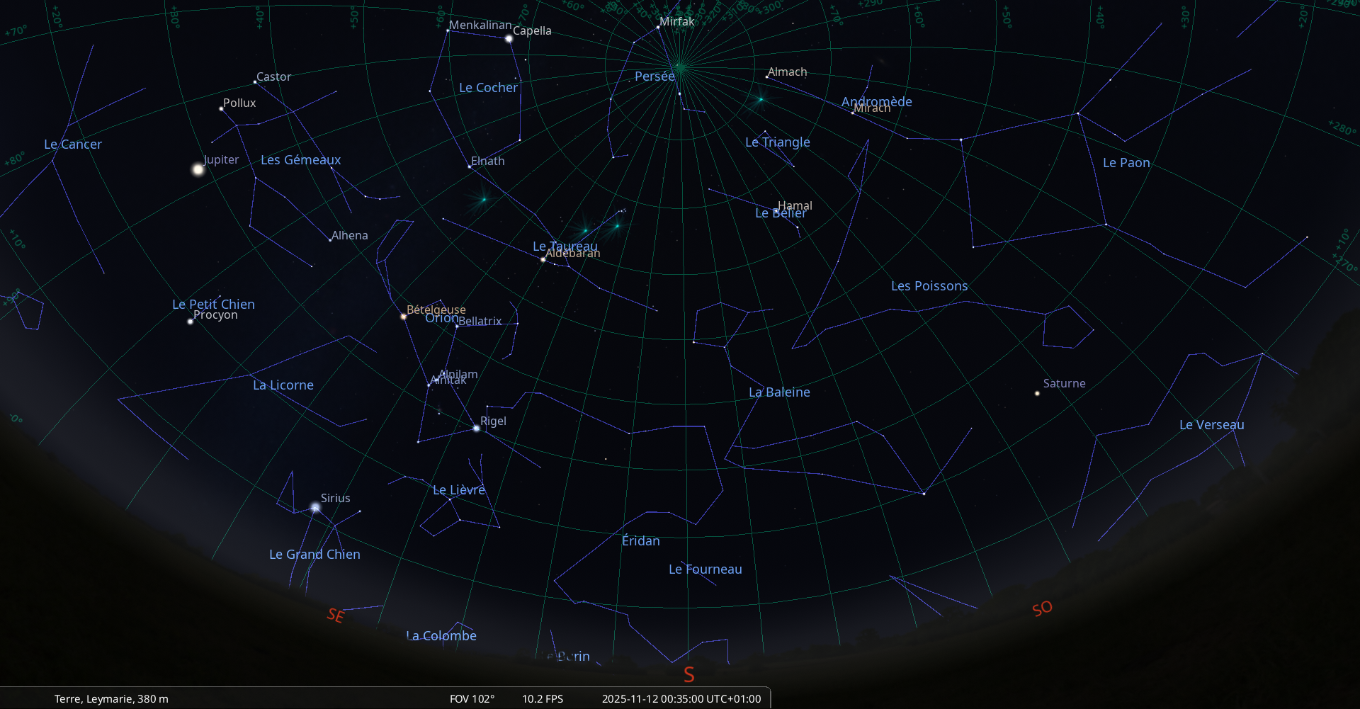 – A 11h06, la Lune arrive devant la constellation du Taureau (Tau) ; longitude 56°39’ (27e TAU) ; latitude +4°46’, monte