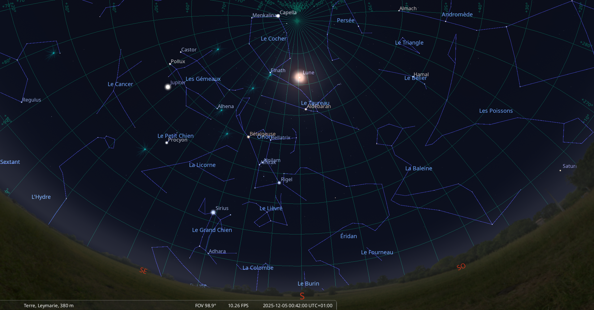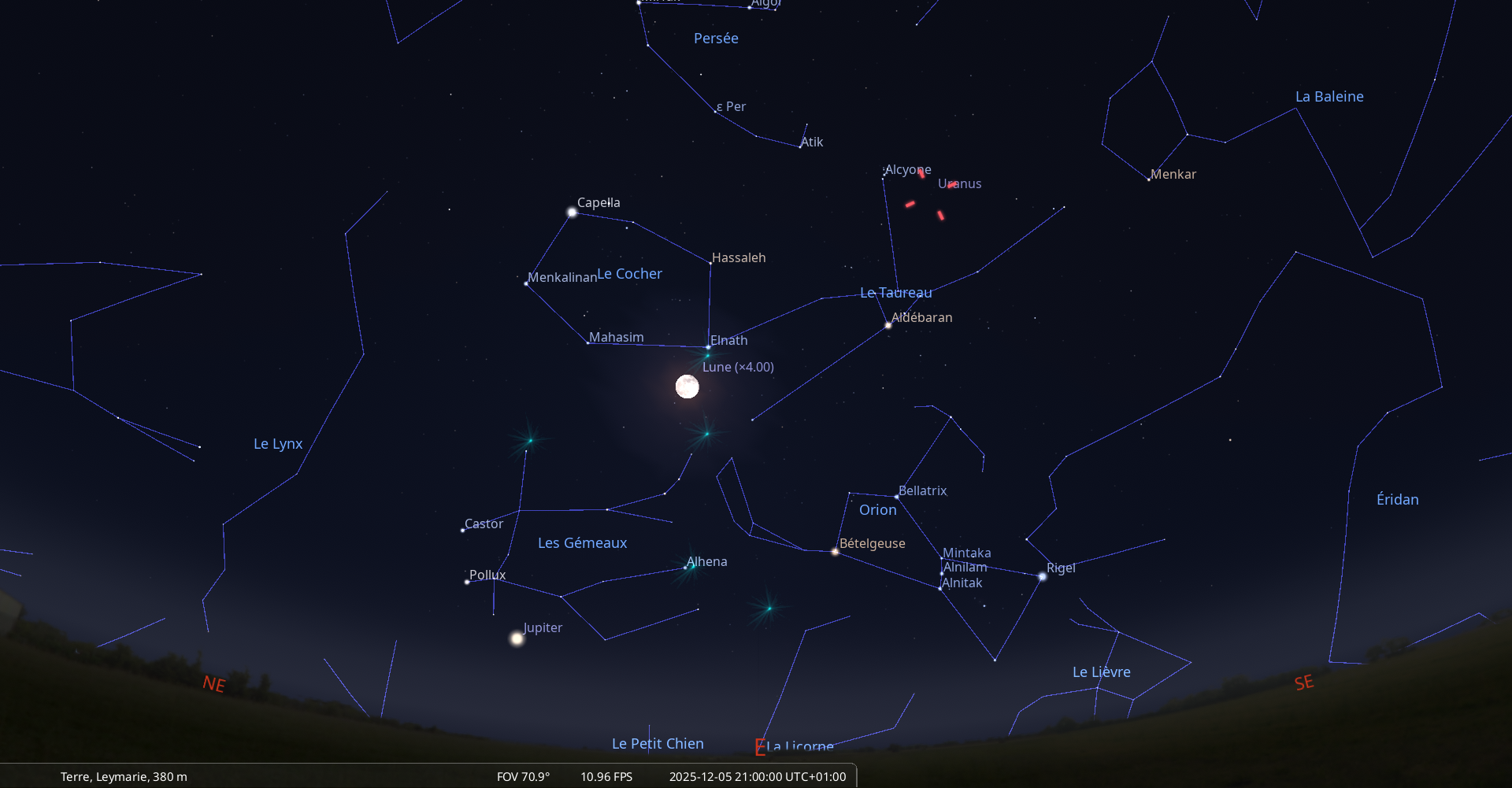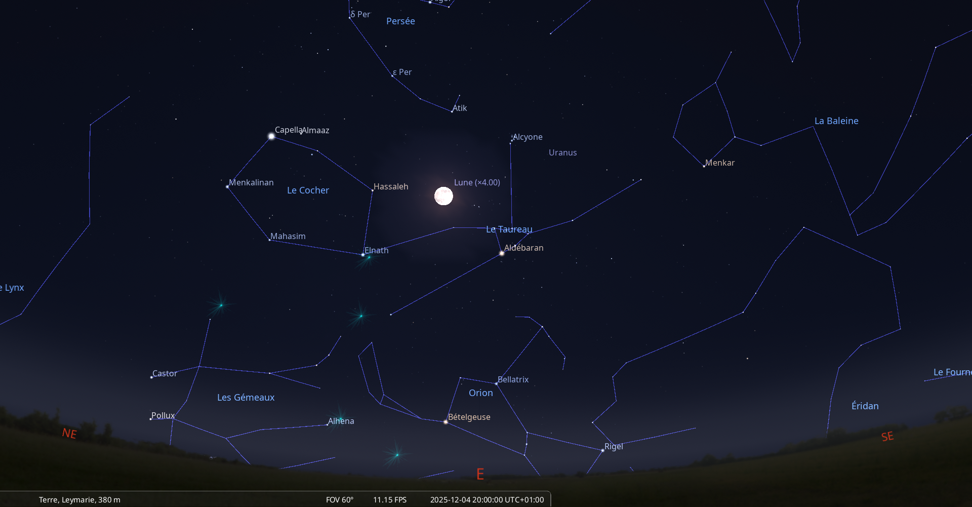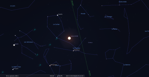 La nuit du 4 au 5 décembre, pour notre localisation, la Lune se lève à 16h35 et Aldébaran, une heure plus tard, à 17h35 ;