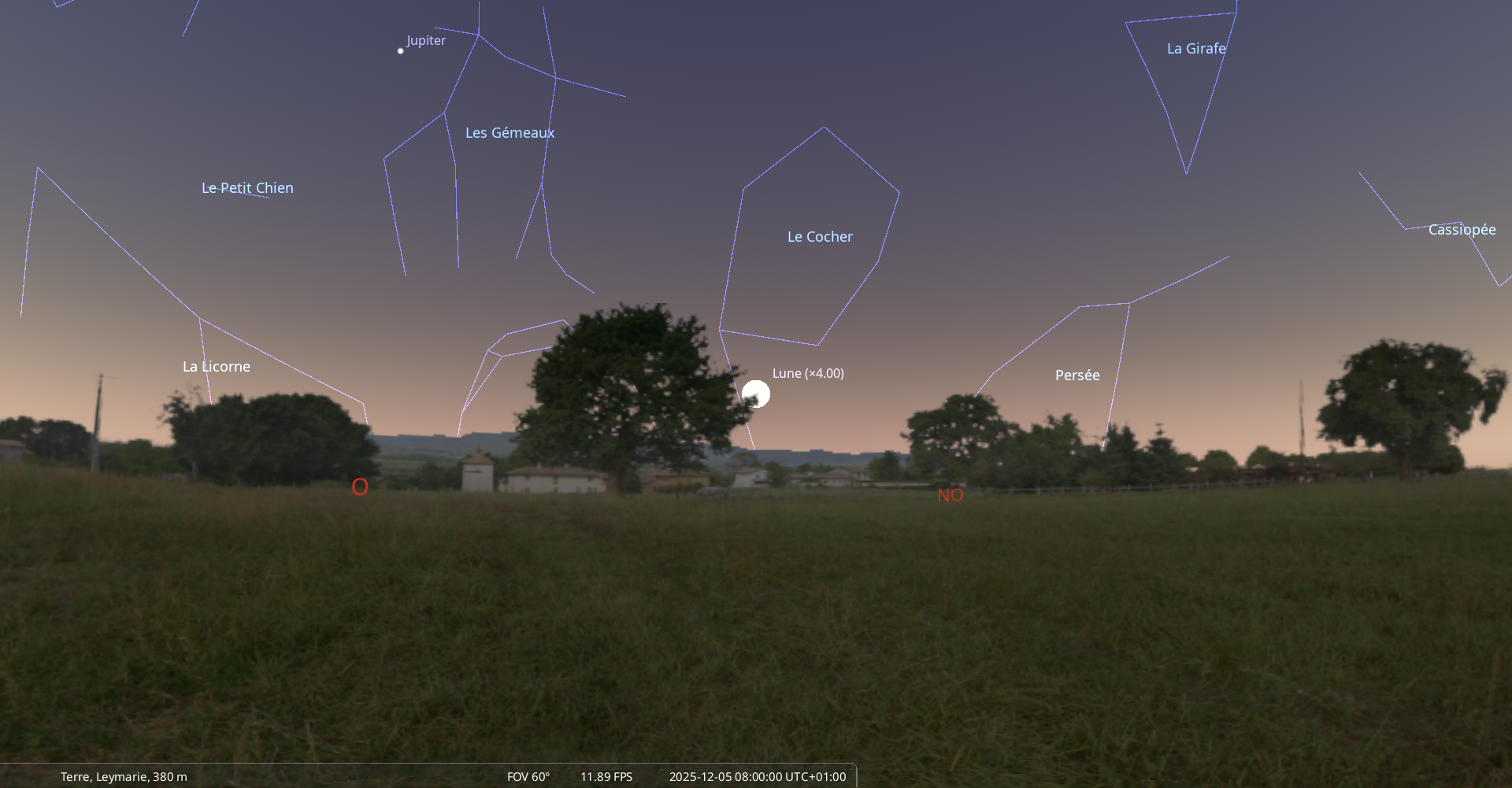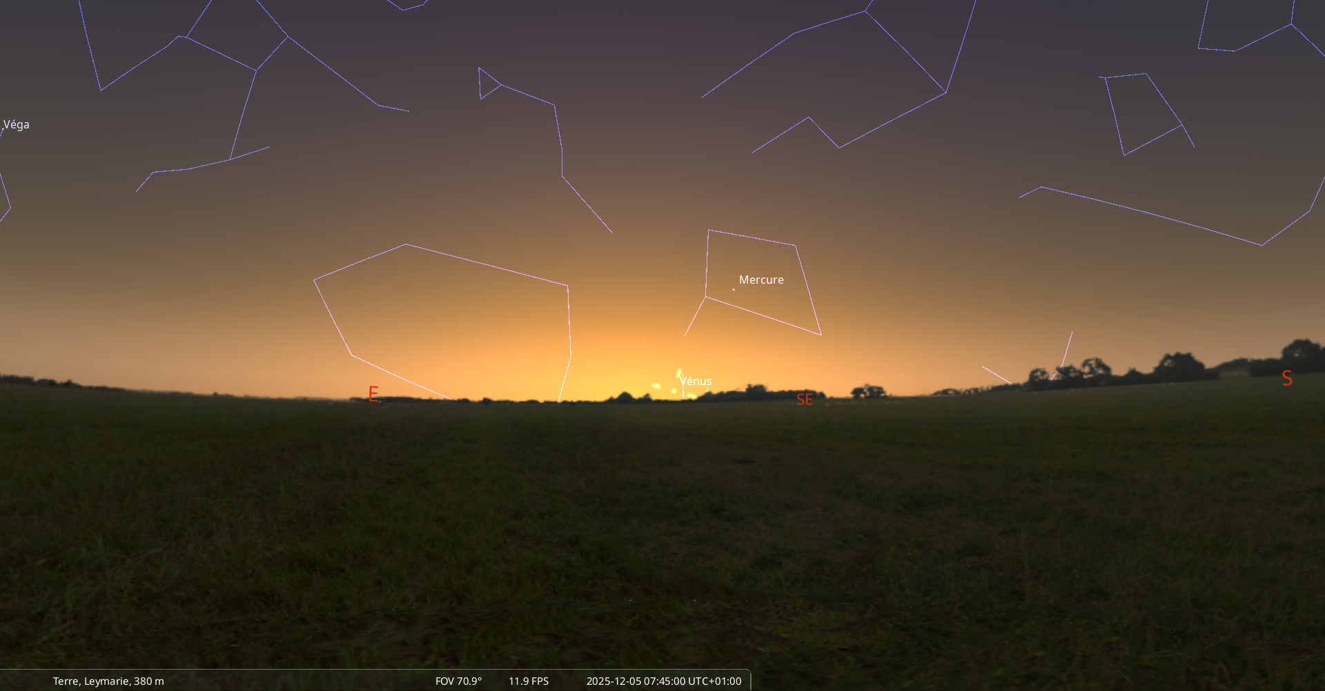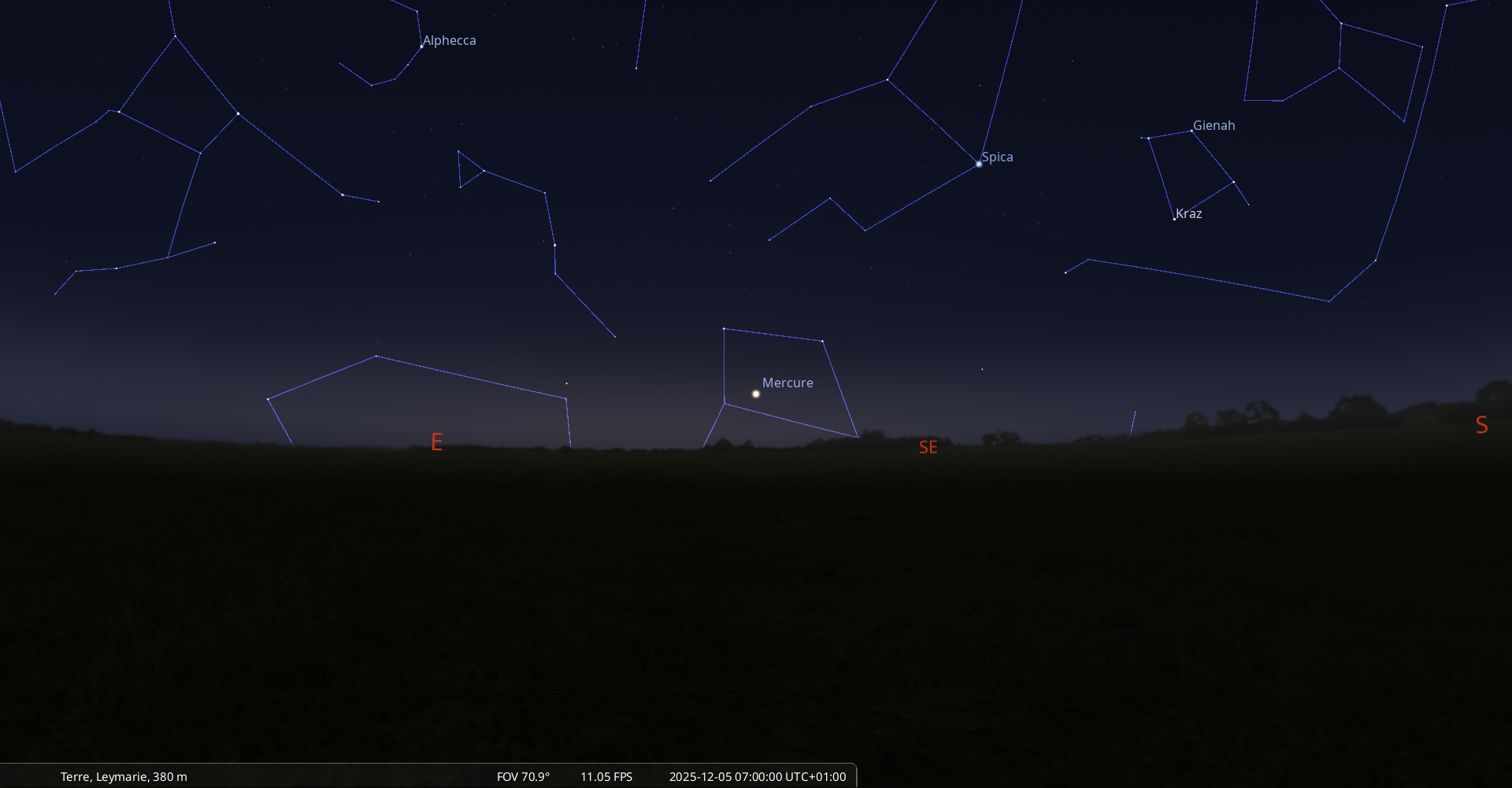 Elle se couche le 5 décembre à l’ouest-nord-ouest à 9h07 soit 55 minutes après le lever du Soleil.