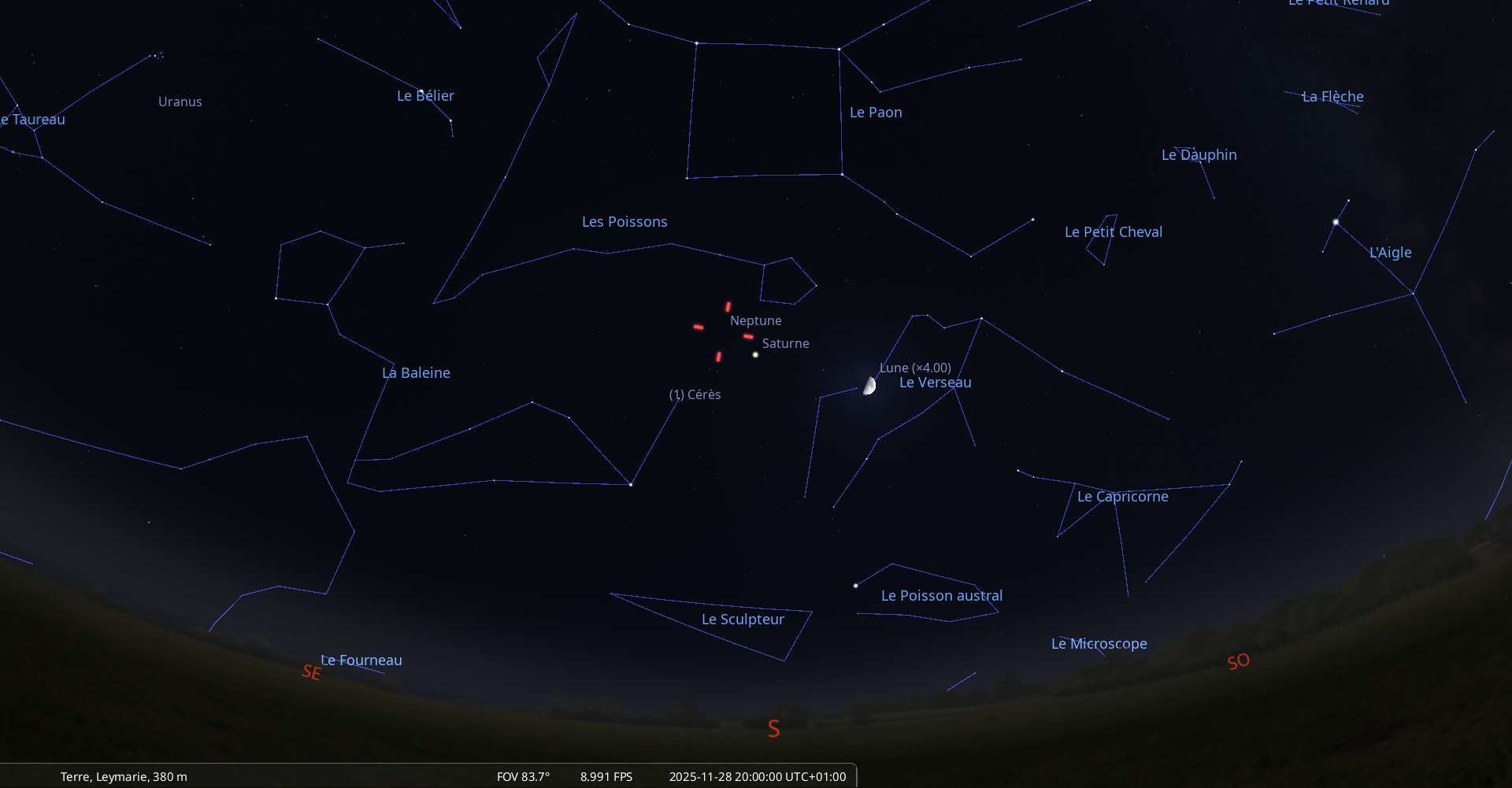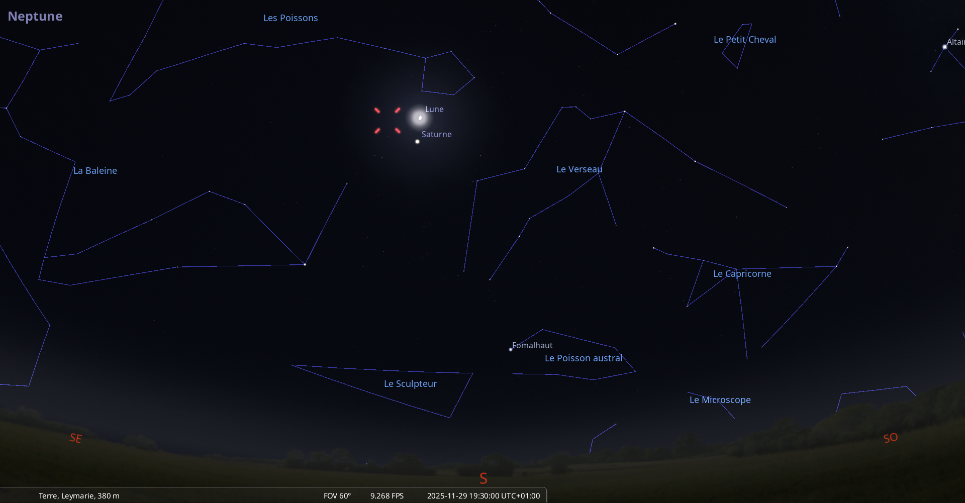 La nuit du 29 au 30 novembre, pour notre localisation, la Lune culmine à 20h01 et Neptune à 20h15.