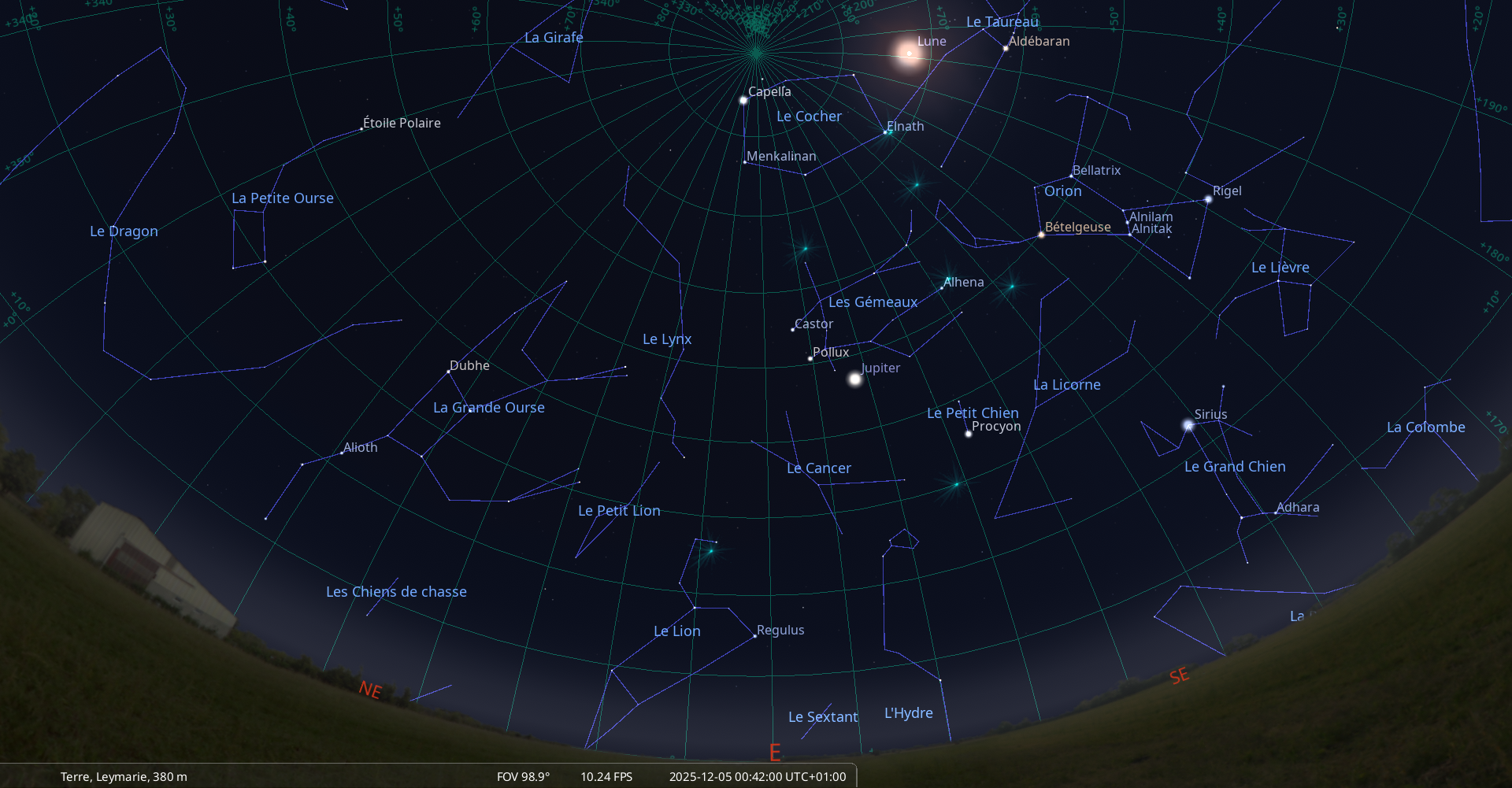 Le 4 décembre au soir, la Lune se lève pratiquement au Nord-est,
