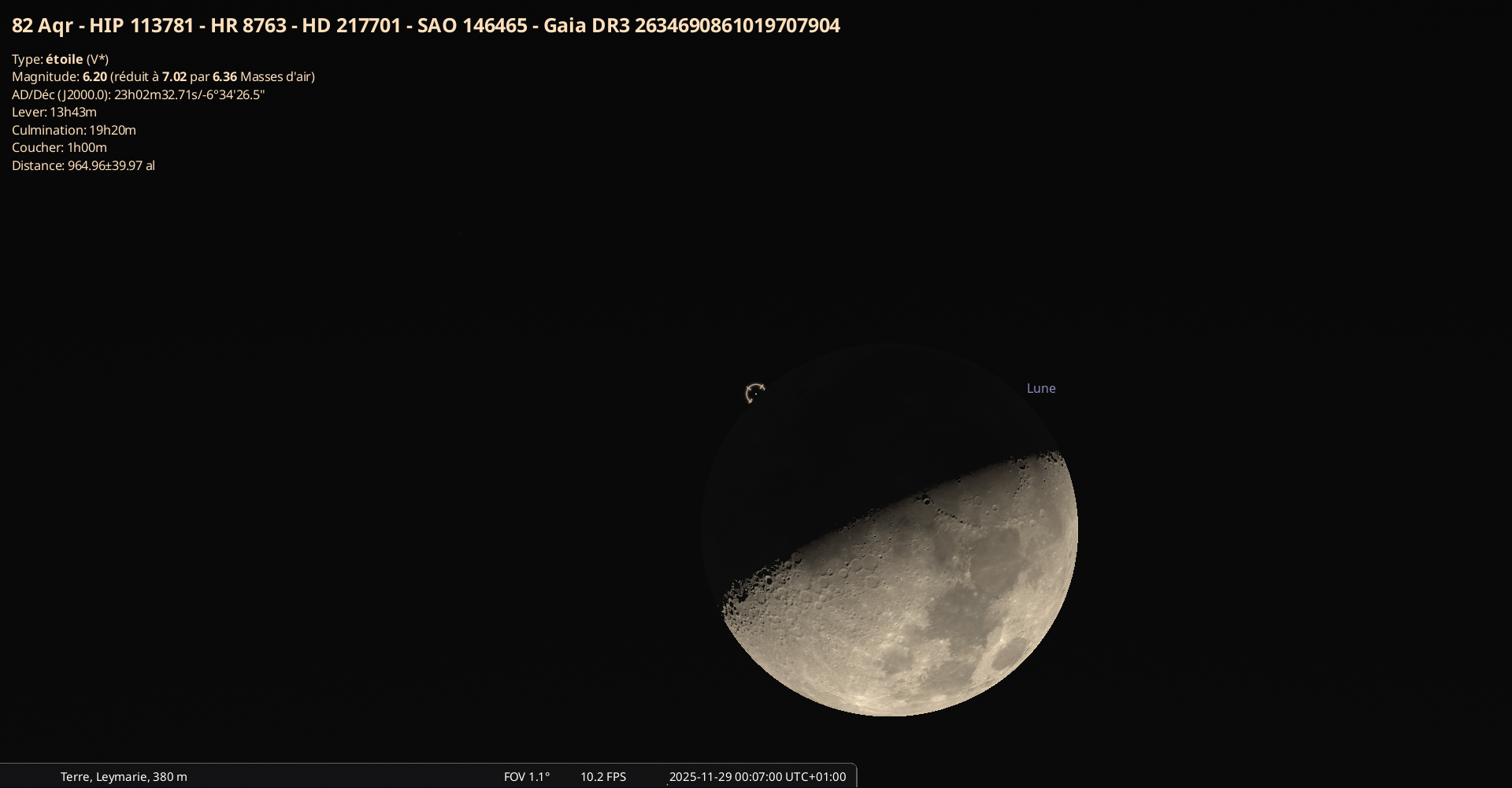 - A 0h07 (pour notre localisation), la Lune occulte l’ étoile 82 Aqr, de la constellation du Verseau, magnitude 6.2
