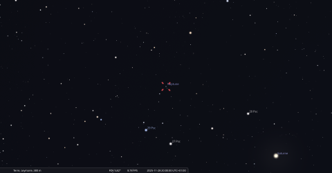 Dans la nuit du 3 au 4 décembre, pour notre localisation, la Lune culmine à 23h34, les Pléiades à 23h48, en companie d’ Uranus ;