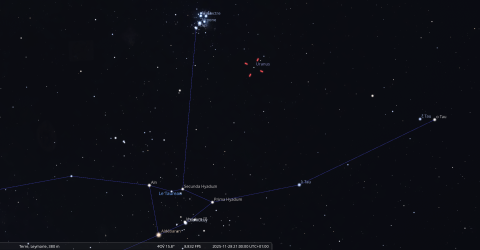 - A 19h41, la Lune est conjointe à Aldébaran dans le plan écliptique, l’étoile (alpha Taureau) 10°27’ au Sud.