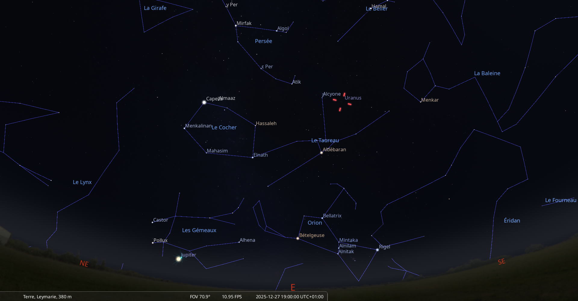 La nuit du 26 au 27 décembre, pour notre localisation, Neptune culmine à 18h29 et se couche à 0h26.