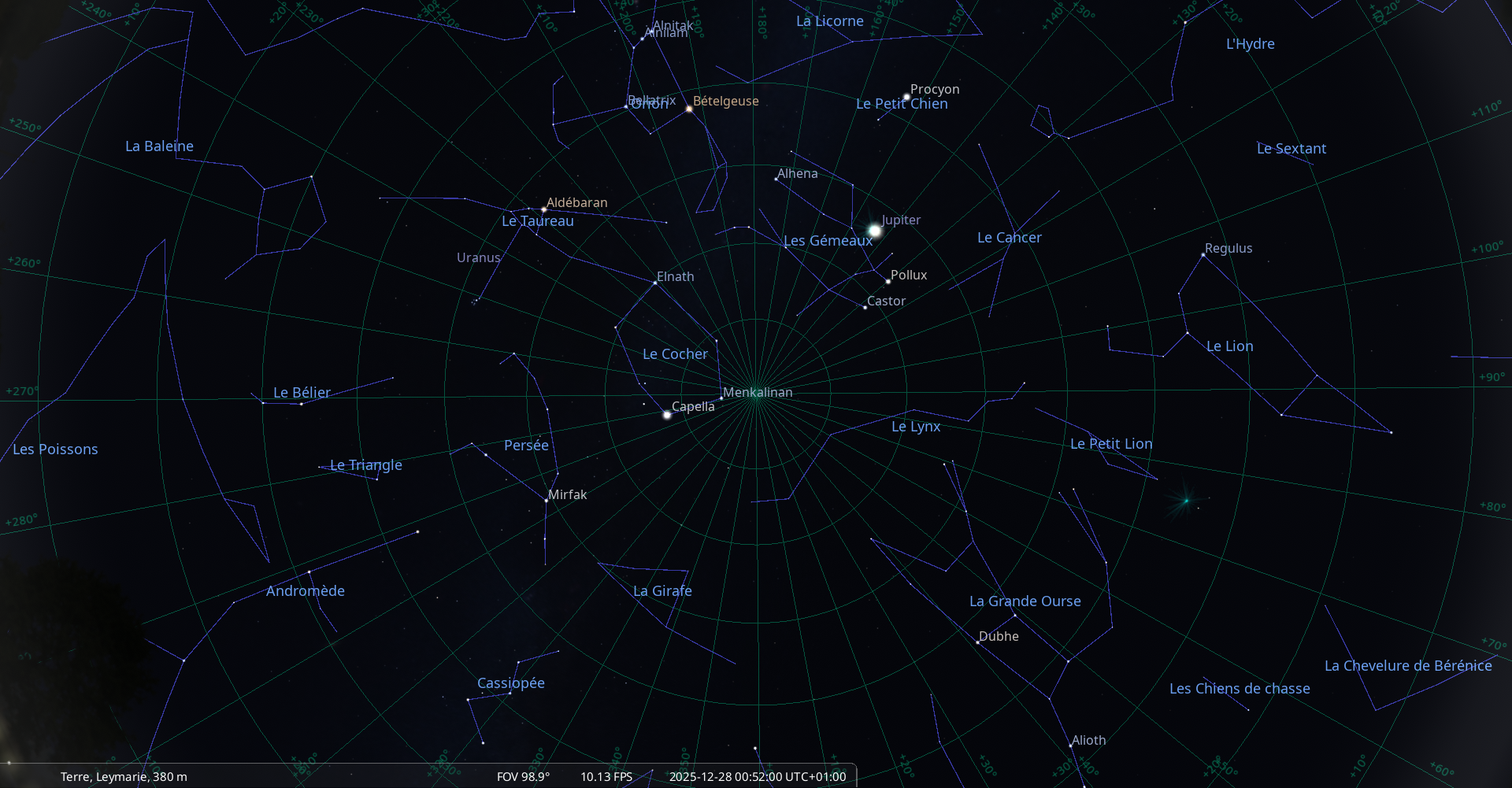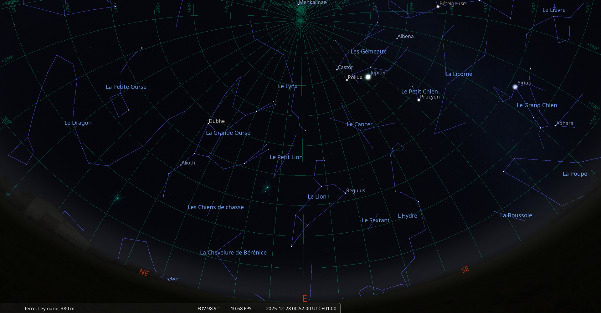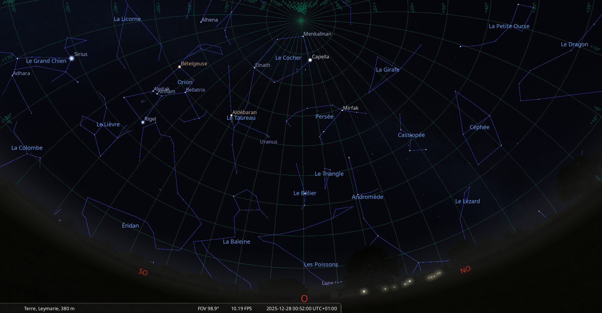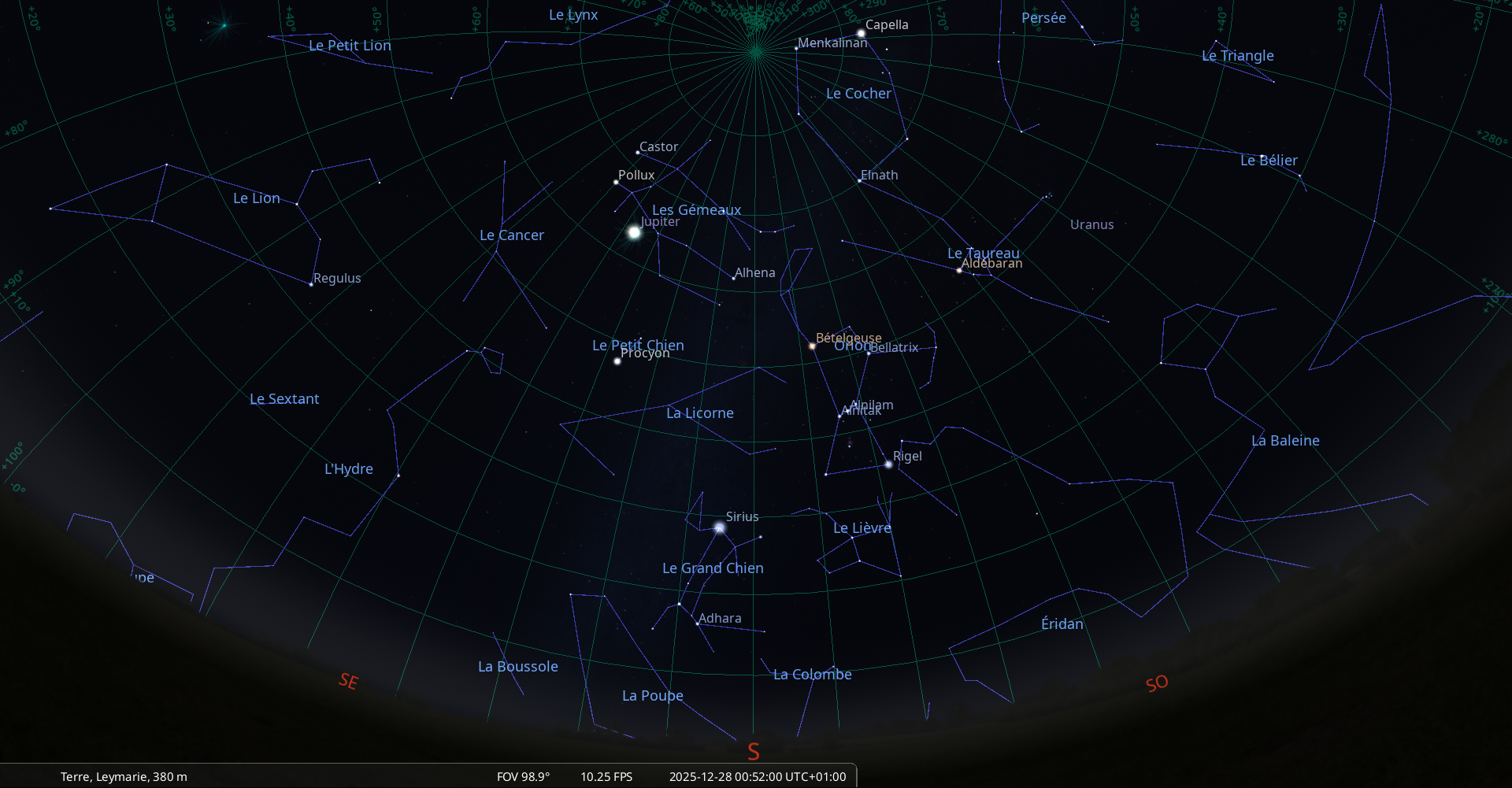– L’étoile Bételgeuse au méridien à la mi-nuit (0h49 pour notre localisation)