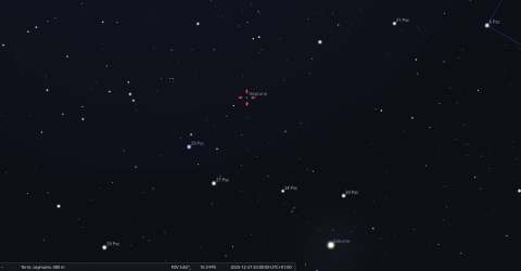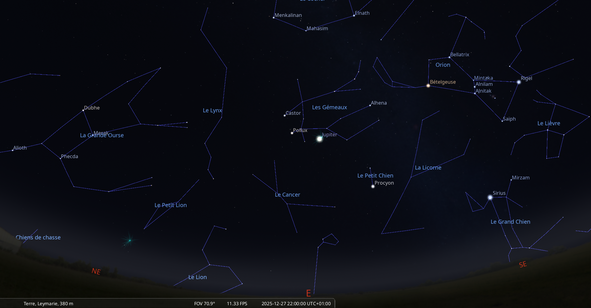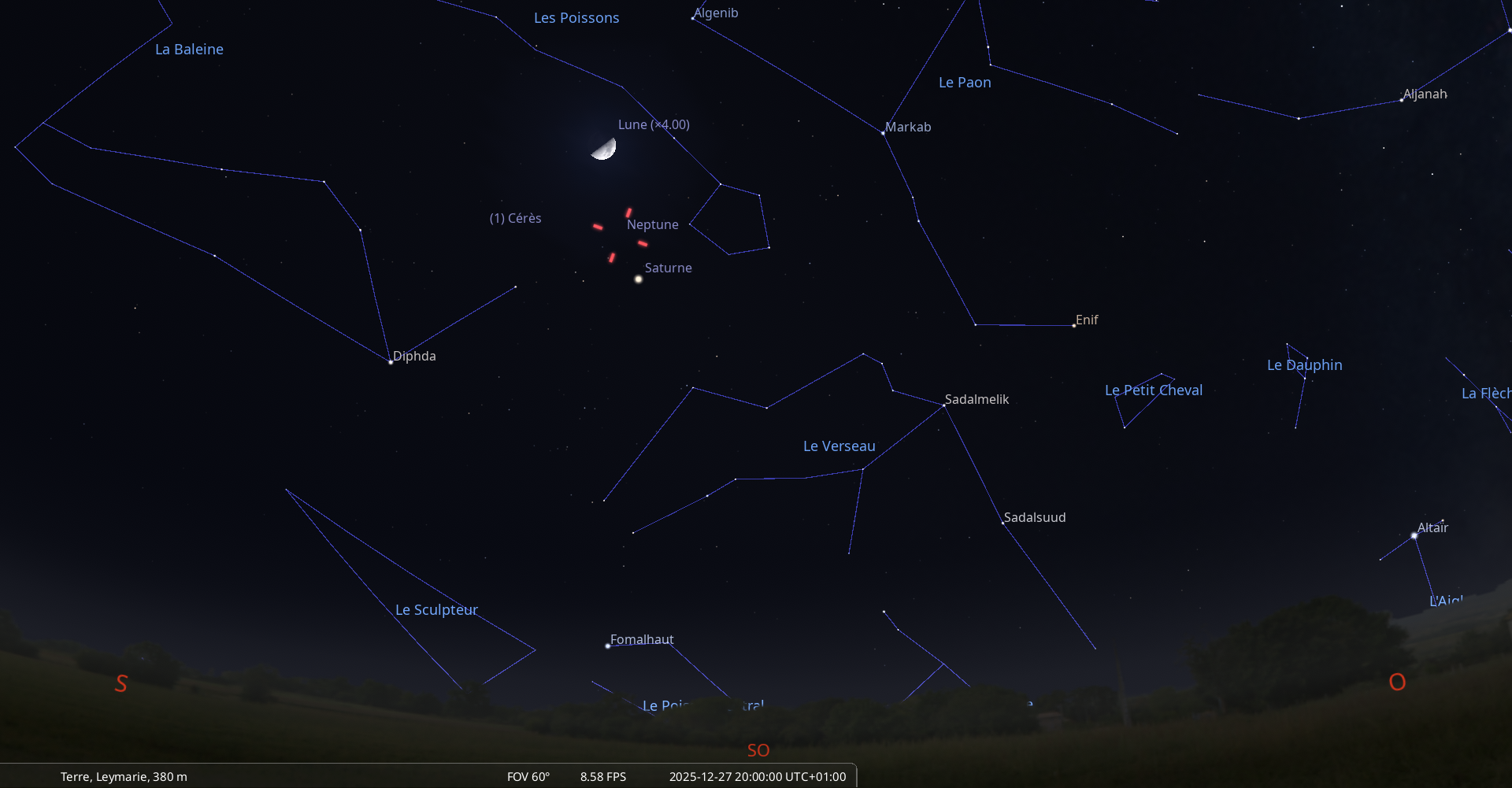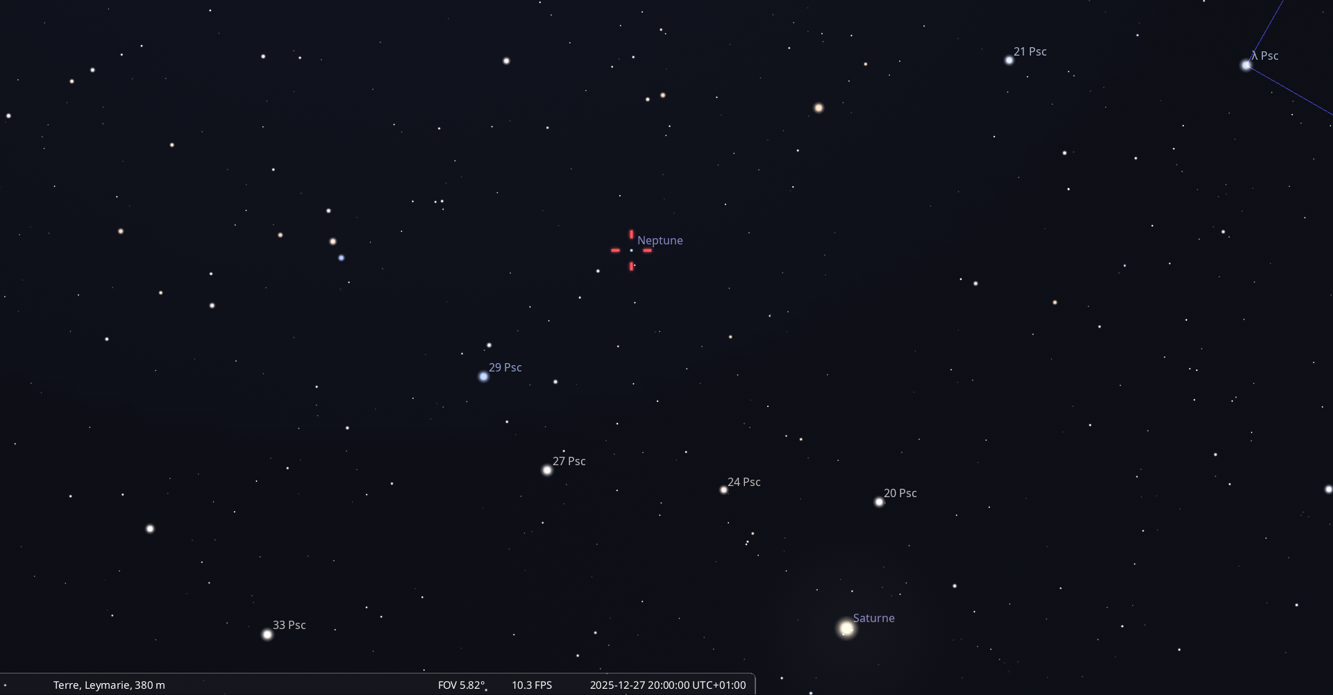 La nuit du 26 au 27 décembre, pour notre localisation, Neptune culmine à 18h29 et se couche à 0h26.