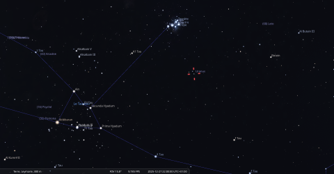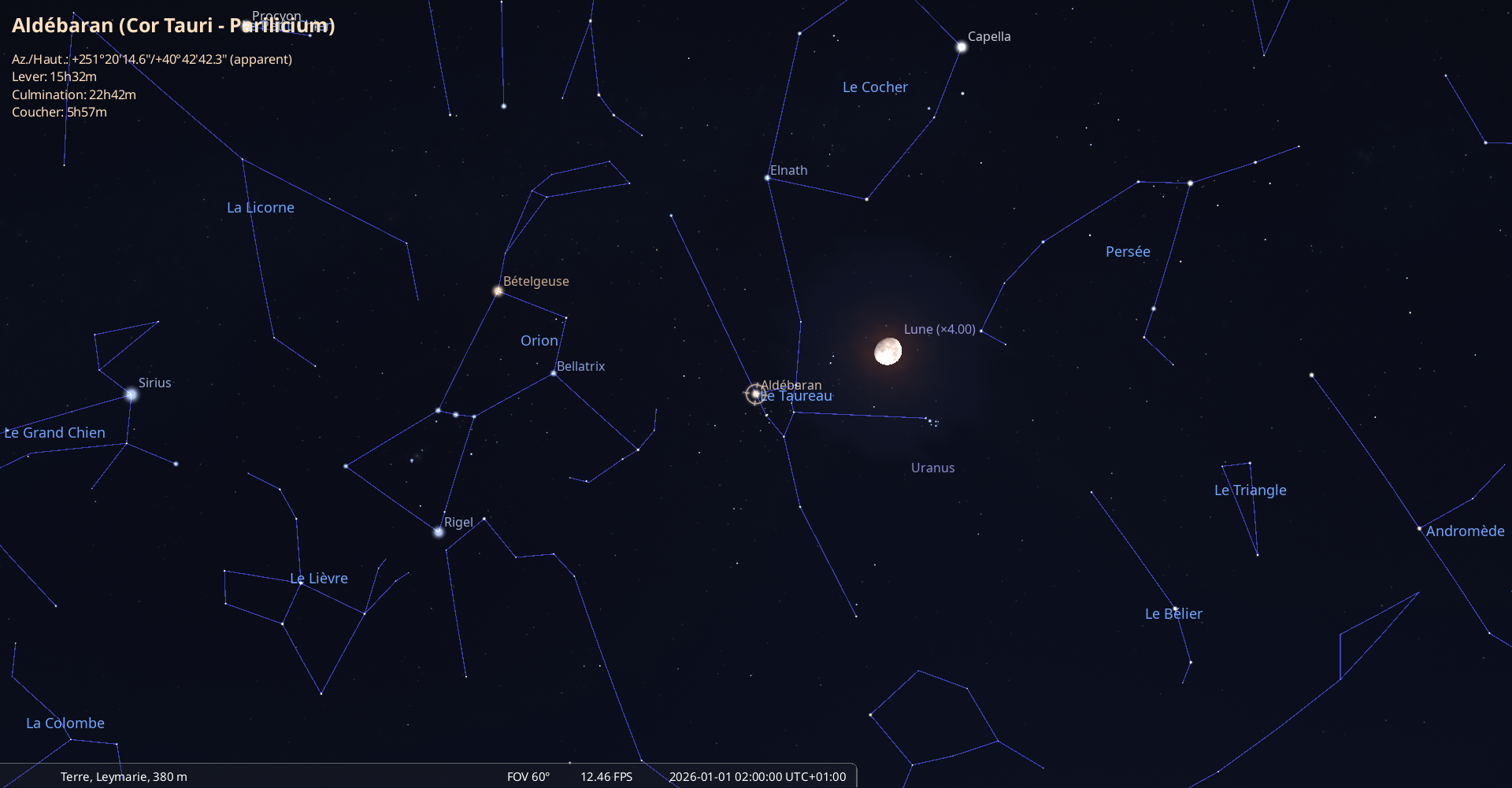 La nuit du 31 décembre au 1er janvier, pour notre localisation, la Lune culmine à 22h17, Aldébaran, à 22h45 ;