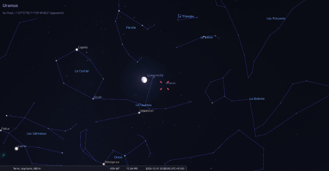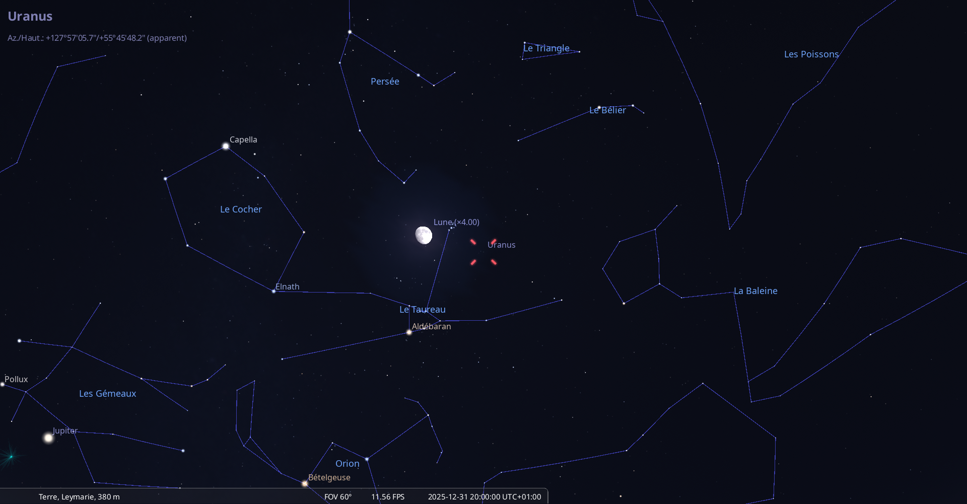 Le 31 décembre au soir, pour notre localisation, Uranus culmine à 22h17, la Lune à 22h17.