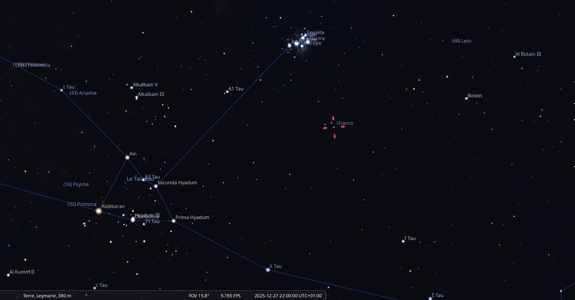 Dans la nuit du 31 décembre au 1er janvier, pour notre localisation, les Pléiades culminent à 21h58, en companie d’ Uranus ;
