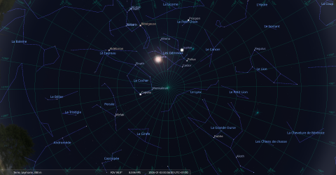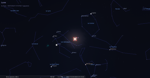 – A 14h22, la Lune arrive devant la constellation des Gémeaux (Gem) ; longitude 90°08’ (1er CAN) ; latitude +4°46’, descend