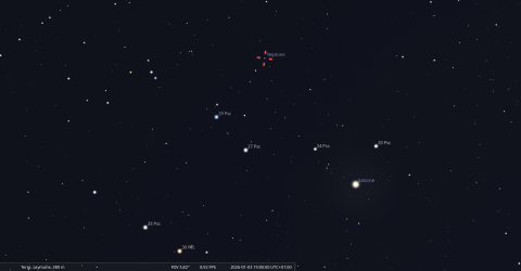 déclinaison 0° ; ascension droite 23h 46m. Longitude écliptique 356°50’ (27e POI), latitude +1°21’, monte