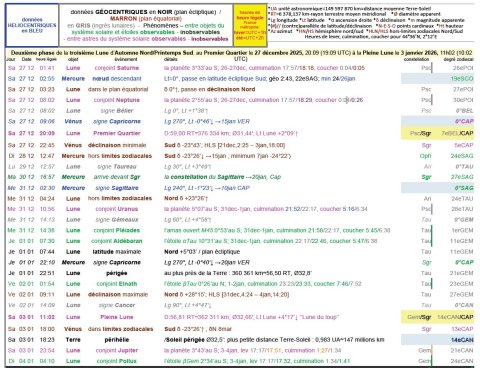- A 1h41, la Lune est conjointe à Saturne dans le plan écliptique, la planète 3°33’ au Sud ; longitude 355°53’ (26e POI)