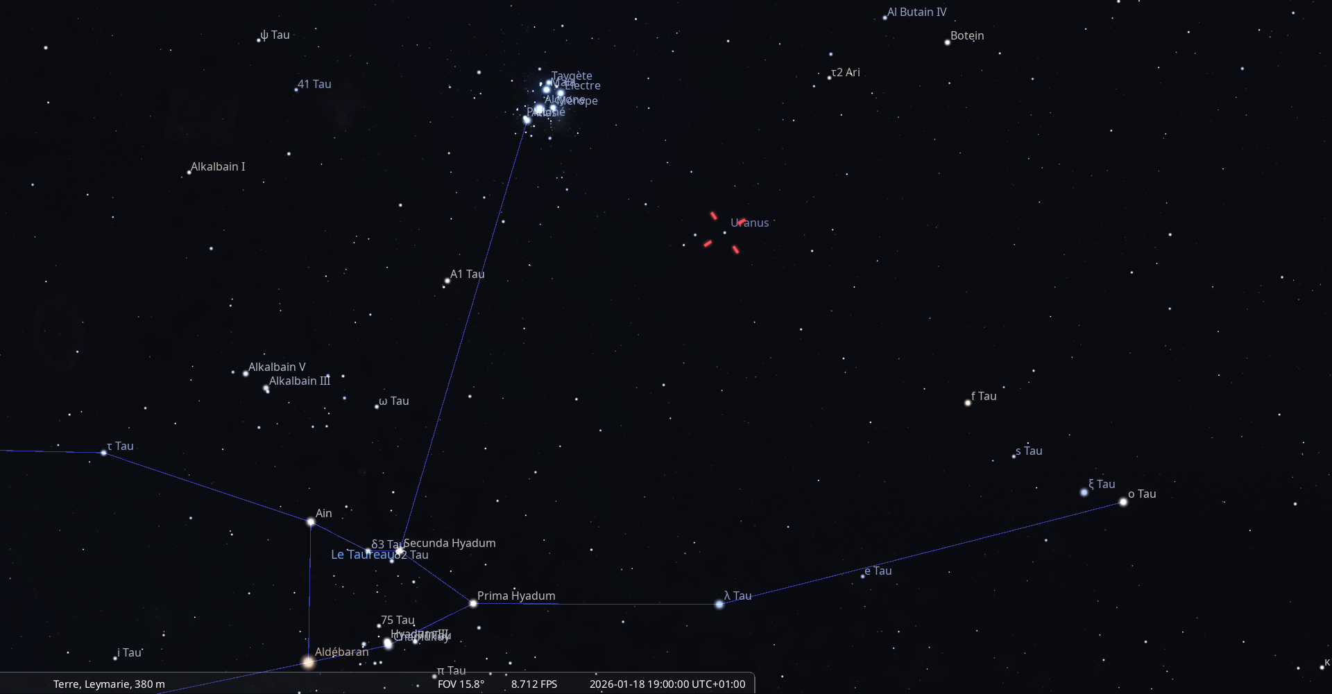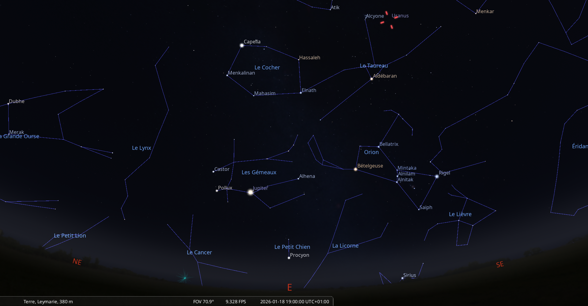 Le 15 janvier, Antarès se lève, comme invariablement, 4 minutes plus tôt que la veille, à 5h37 et la Lune, passée à sa gauche, à 6h10.