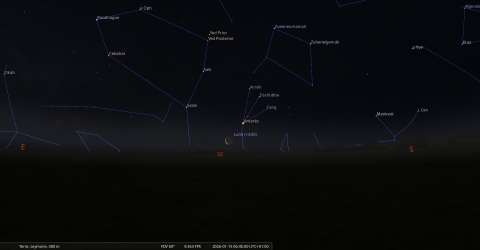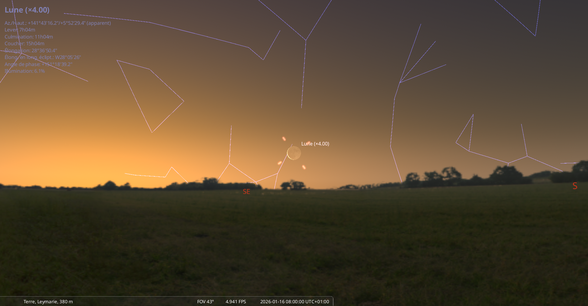sa portion éclairée est de 19% ; les deux astres sont au levant, au Sud-est, à 5° de hauteur.