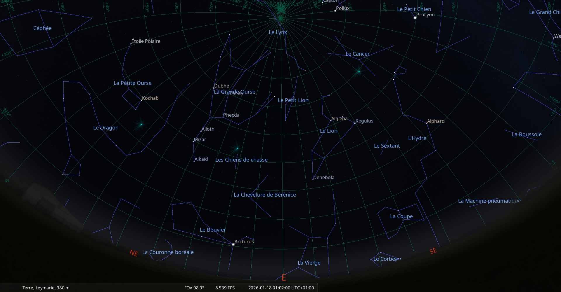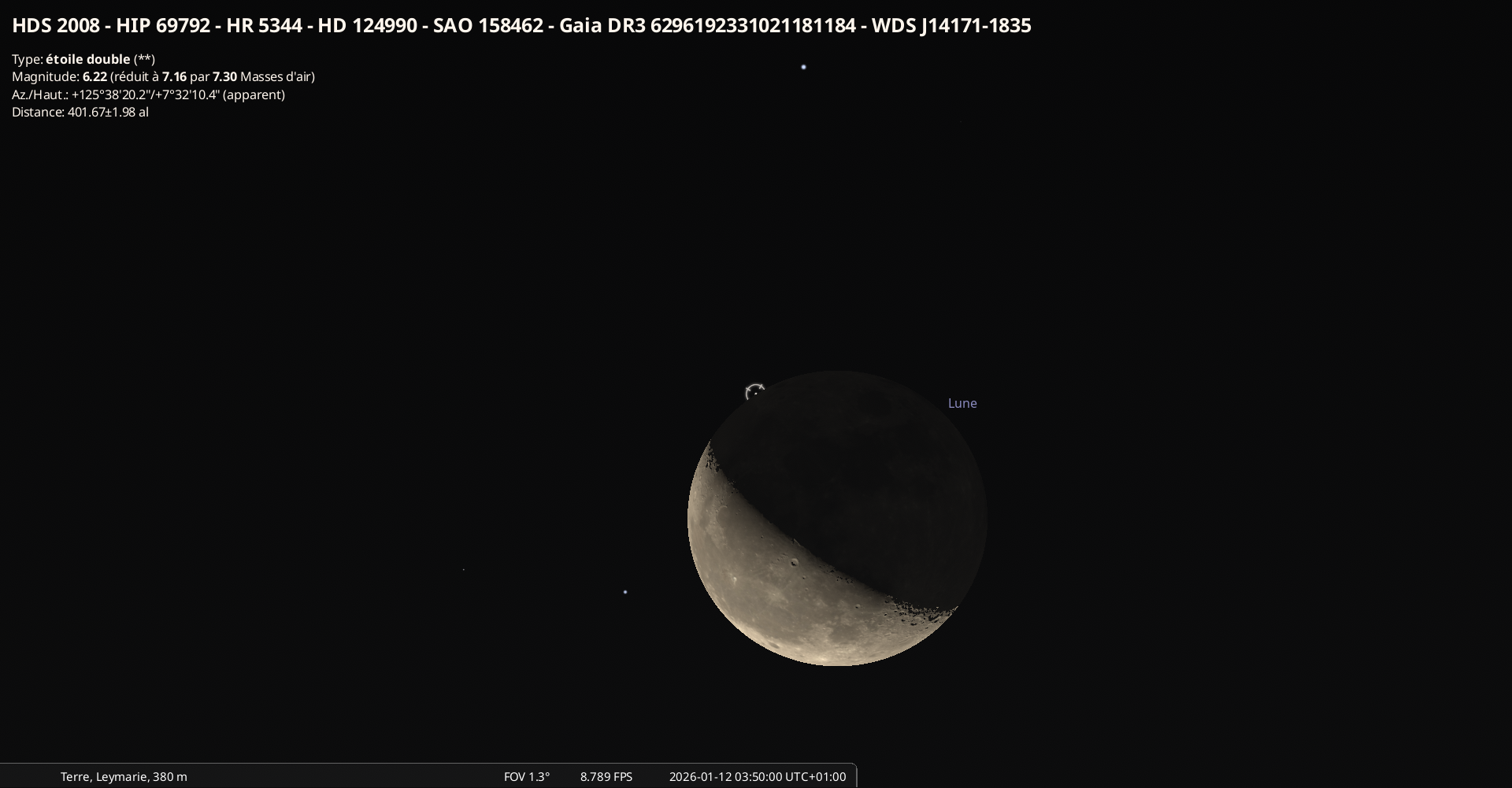 - A 3h50 (pour notre localisation), l’étoile HD 124 990 (constellation de la Vierge -Vir), magnitude 6.2,