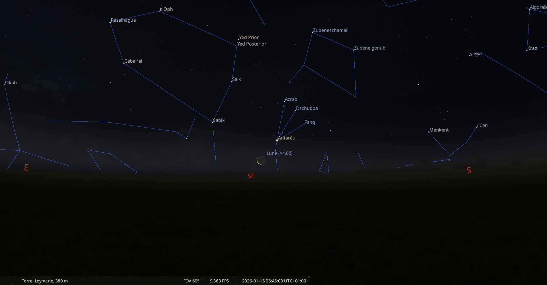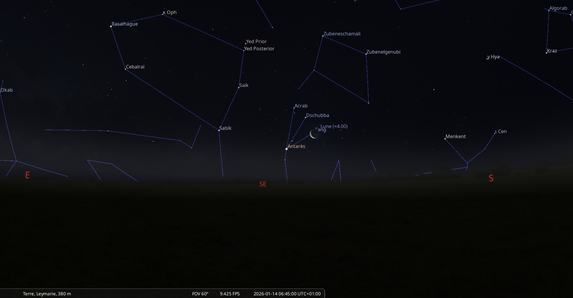 Le 14 janvier, pour notre localisation, la Lune se lève à 5h06, Antarès à 5h41.