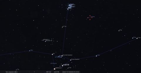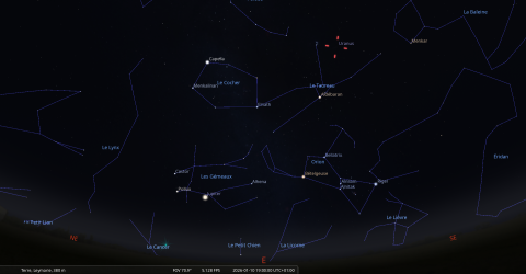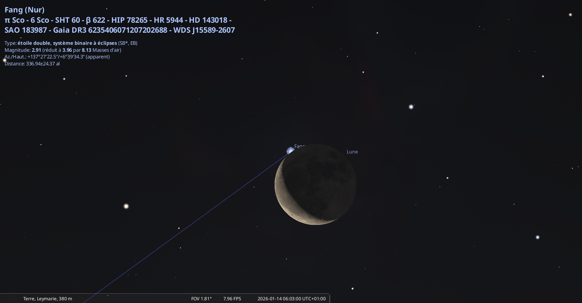 - A 6h03 (pour notre localisation), l’étoile Fang - 6 Sco (constellation du Scorpion), magnitude 2.9,