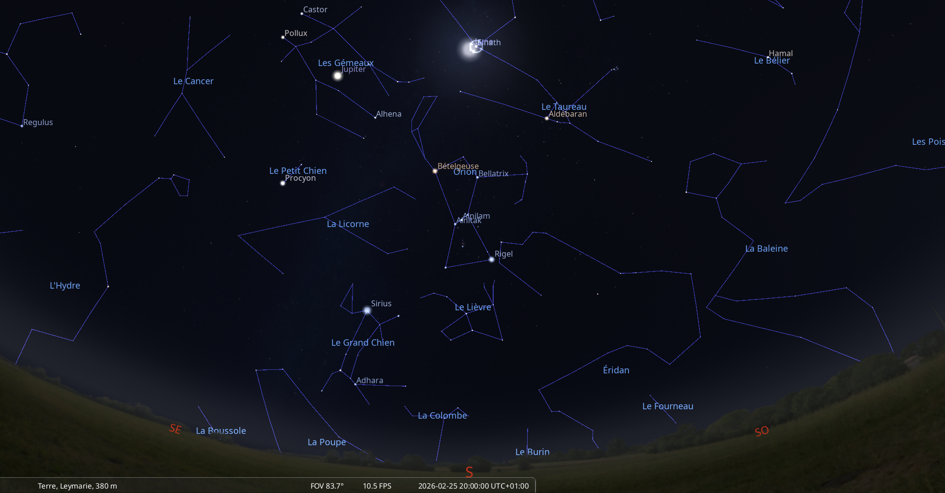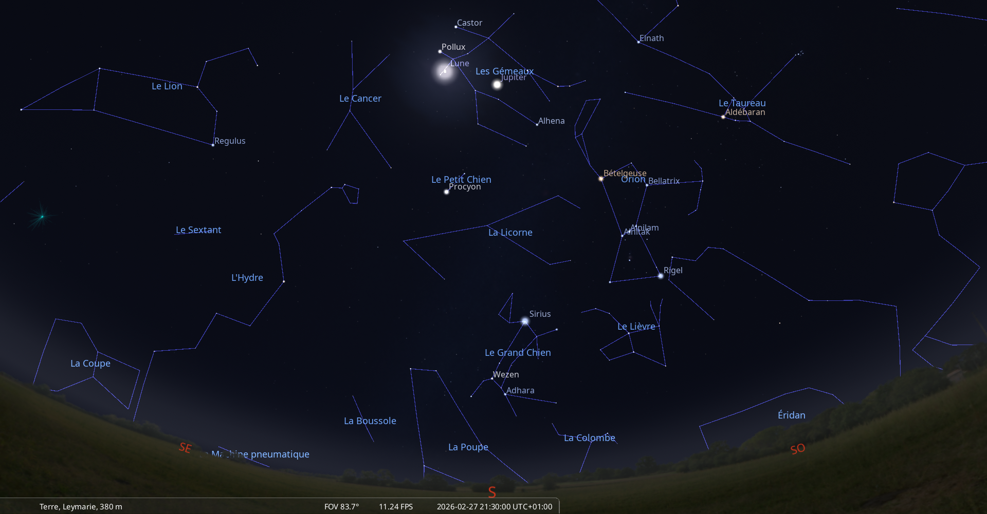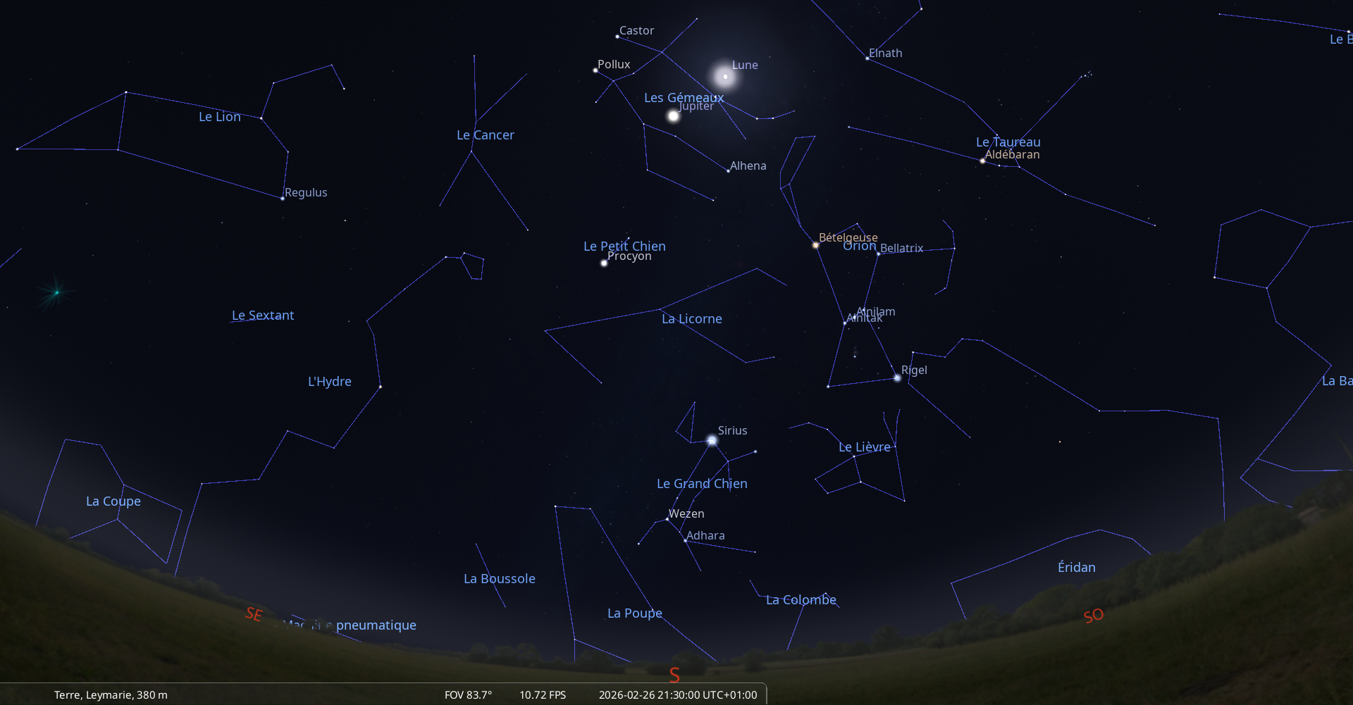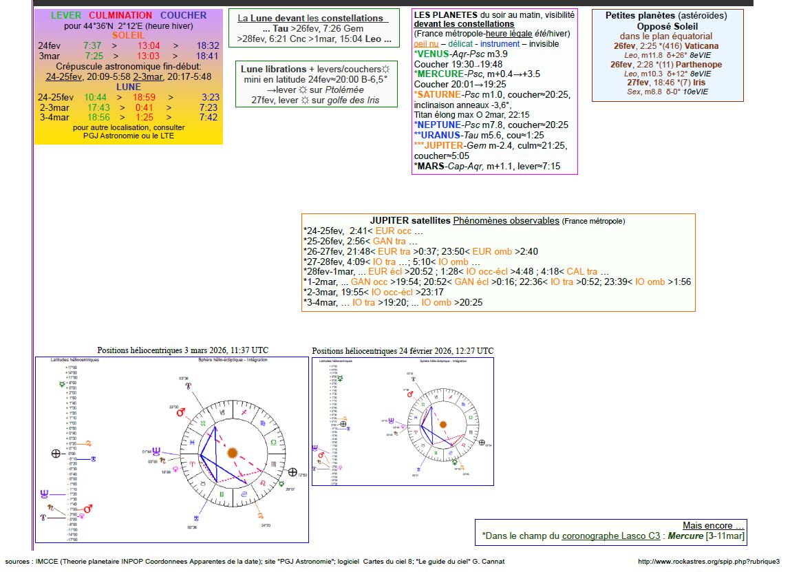 La nuit du 26 au 27 février, pour notre localisation, la Lune culmine à 21h04, Jupiter à 21h31 ;