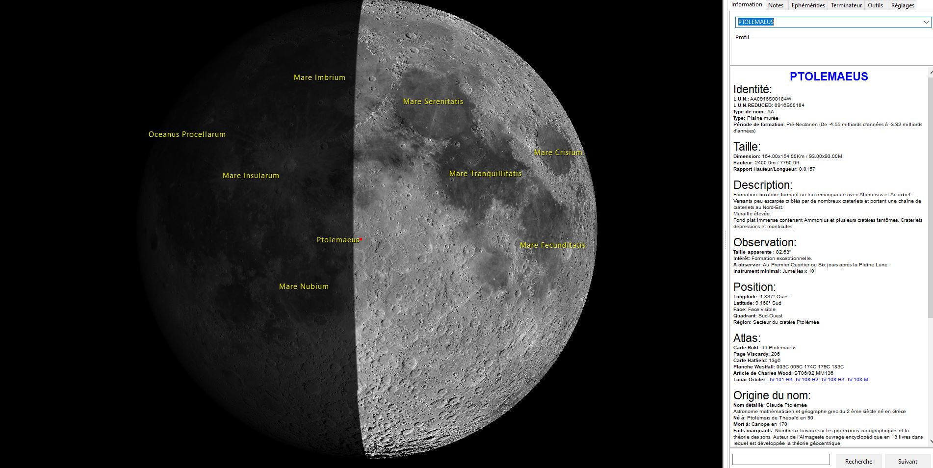 en particulier le cratère Ptolémée qui se retrouve au centre de la demi-Lune.