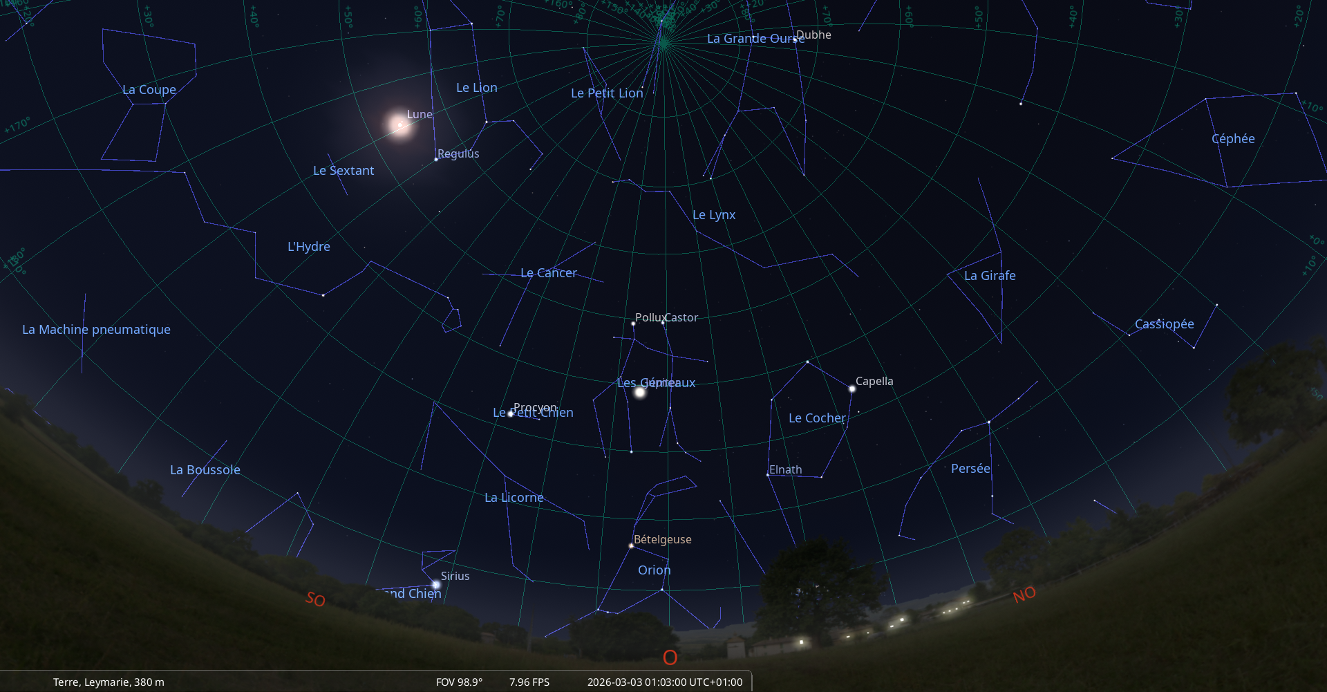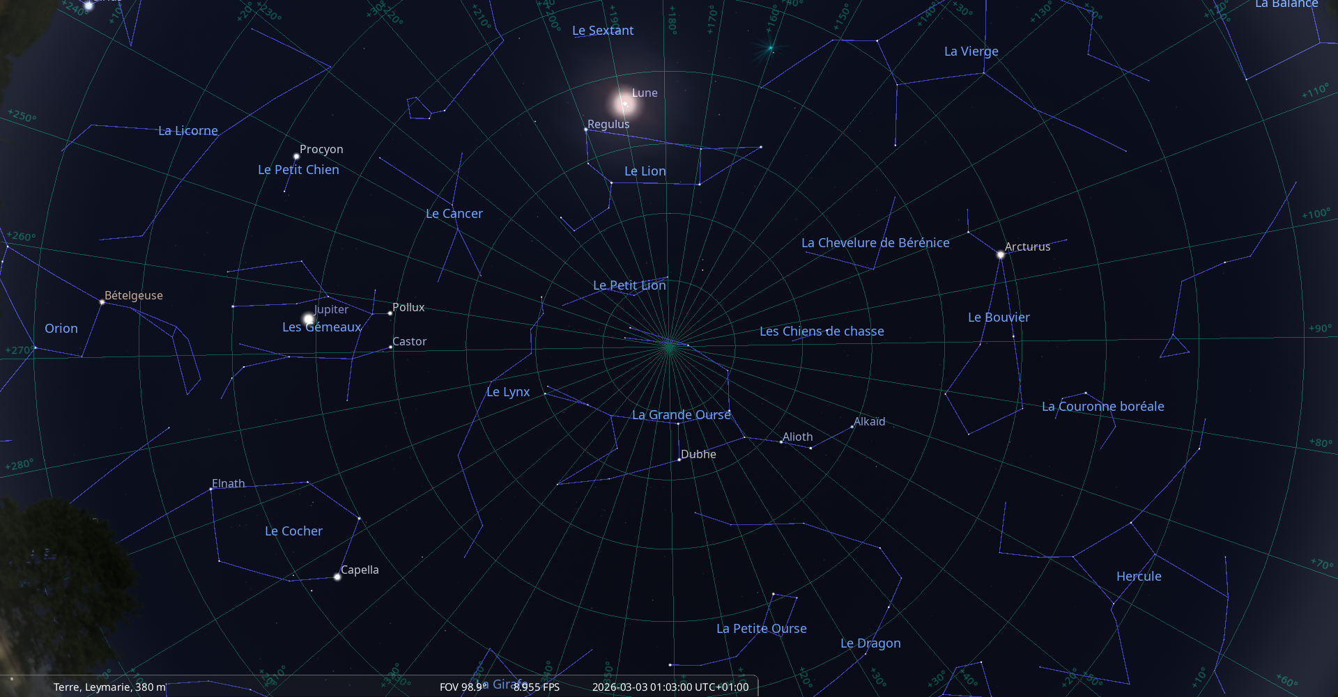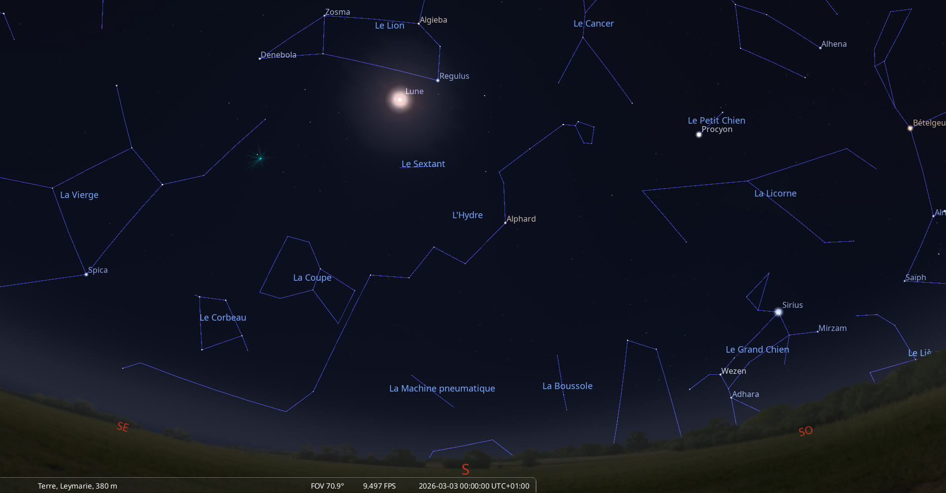 La nuit du 2 au 3 mars, pour notre localisation, Regulus culmine à 0h18, la Lune à 0h41 ;