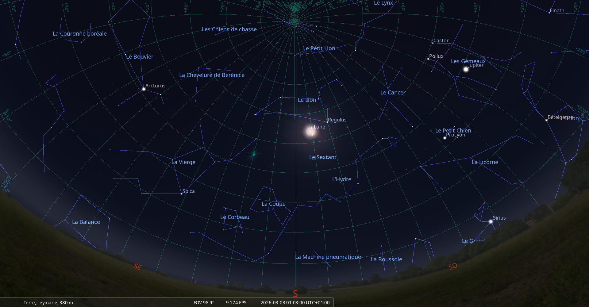 – (11) Parthénope, m 10.3, qui se trouve devant le Lion (Leo) le 26 février