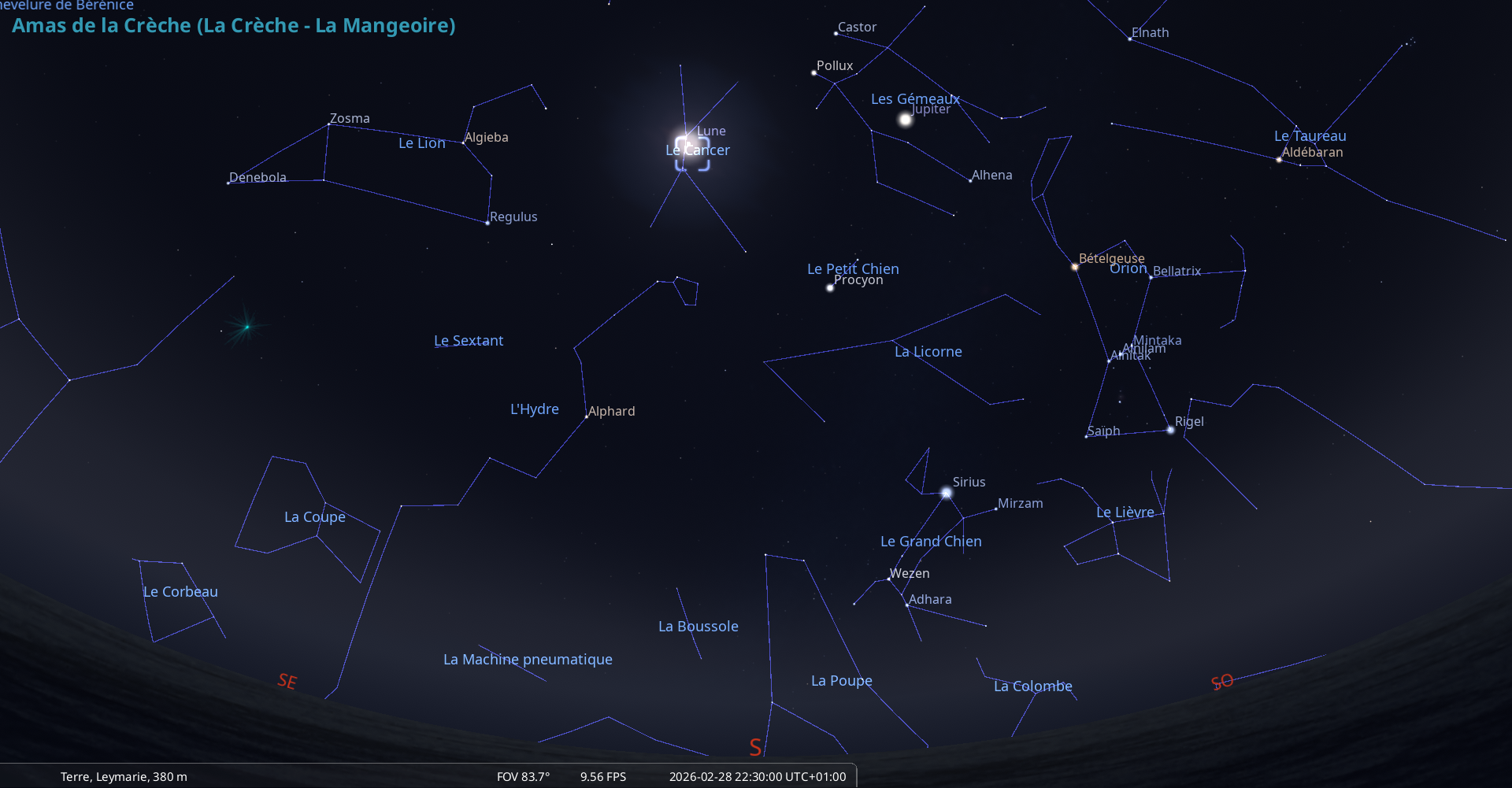 La nuit du 28 février au 1er mars, pour notre localisation, la Crèche culmine à 22h58, la Lune à 23h01 ;