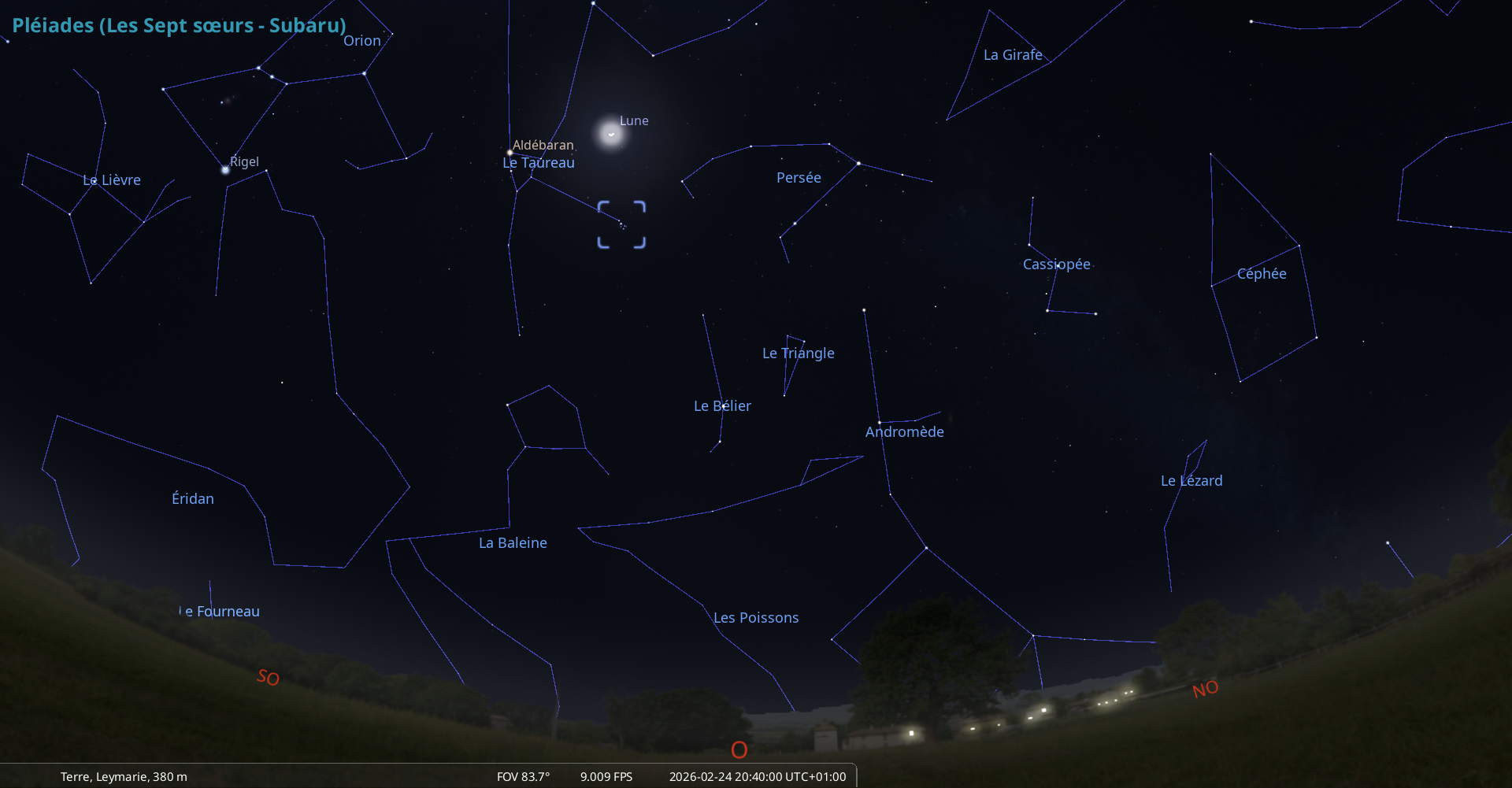 Dans la nuit du 23 au 24 février, pour notre localisation, la Lune se couche à 2h07, les Pléiades à 2h13