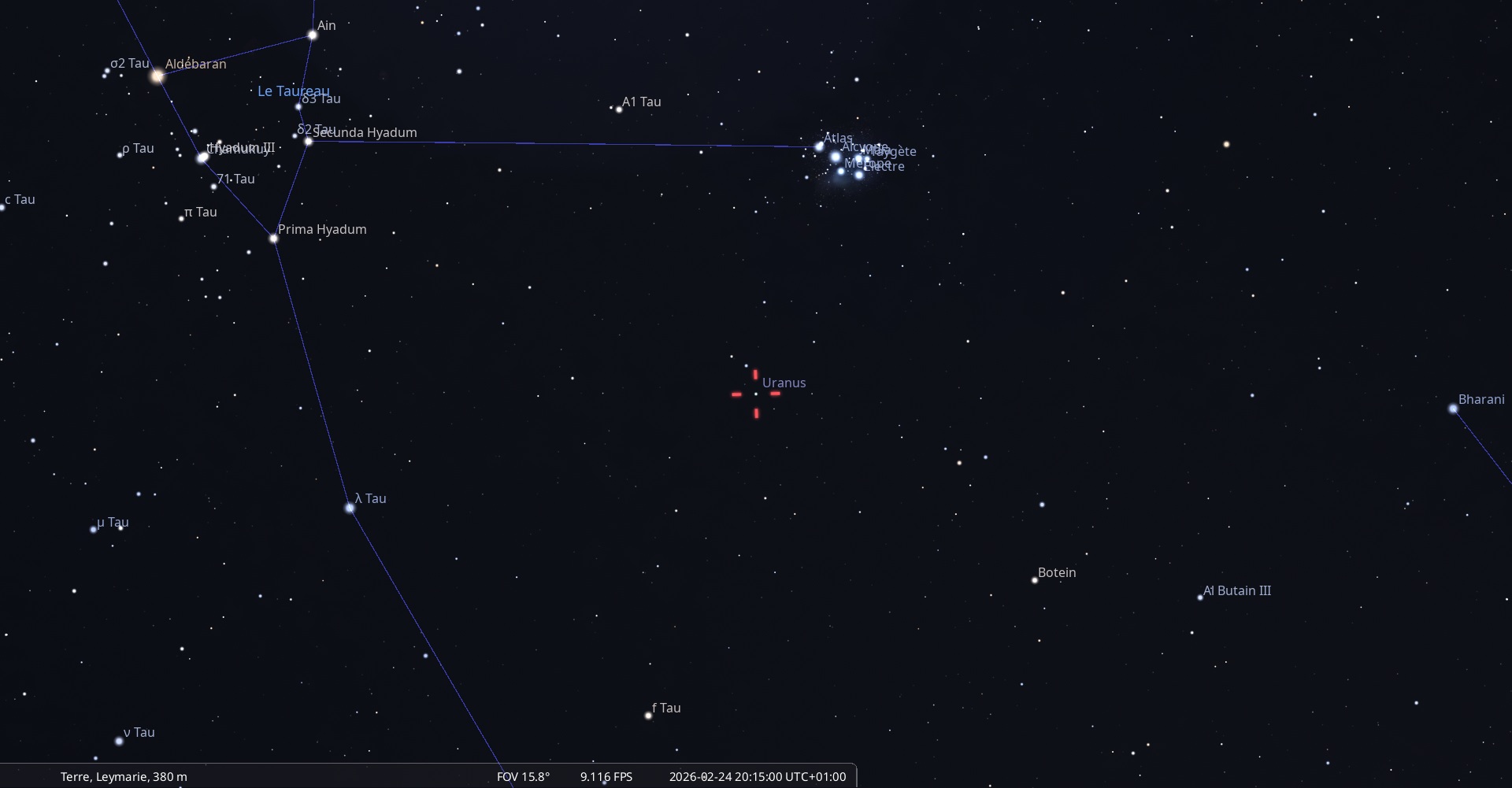 La nuit du 24 au 25 février, pour notre localisation, la Lune culmine à 18h59 Aldébaran à 19h10 ;