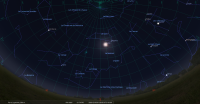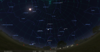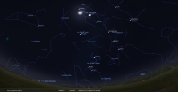 La nuit du 27 au 28, Jupiter culmine à 21h27, la Lune à 22h04 ; Jupiter se couche à 5h04, la Lune à 6h02.