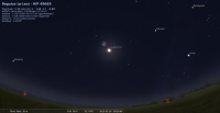 – Elle est conjointe à Régulus à 23h29 dans le plan écliptique (soit le 29 à 0h29 légales) - puisque Régulus, marque, de nos jours, en raison de la précession des équinoxes, le 1er degré du signe de la Vierge - , l’étoile 5°26’ au Nord. A suivre tout au long de la nuit à partir de leur lever, aux alentours de 20h légales.