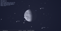 – La Lune est conjointe à Spica à 1h32 dans le plan écliptique et à 1h45 dans le plan équatorial, l’étoile 0,3° au Nord (image ci-dessous). Les deux astres se lèvent peu avant 0h30 légales, Spica coiffant le pôle Nord de la Lune.